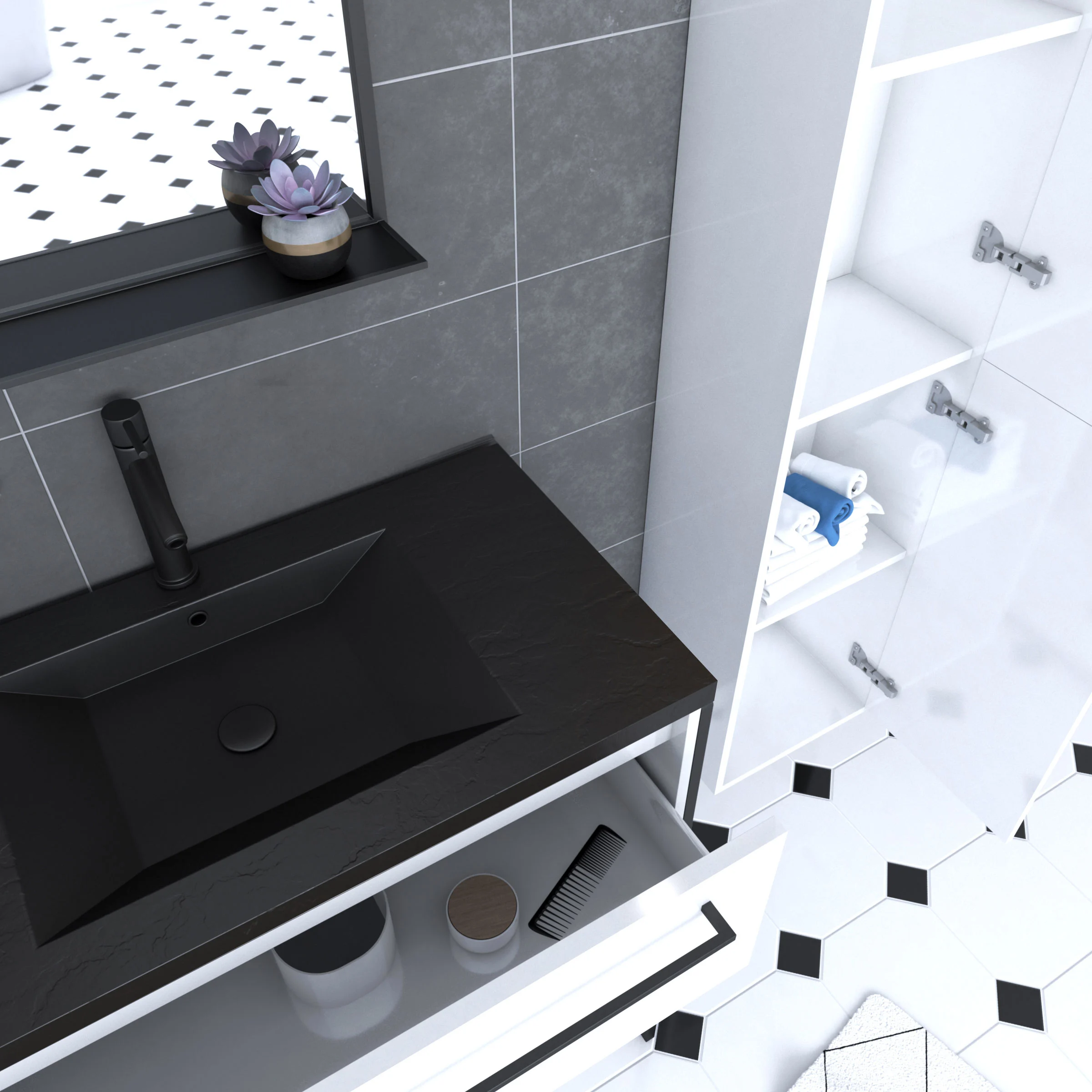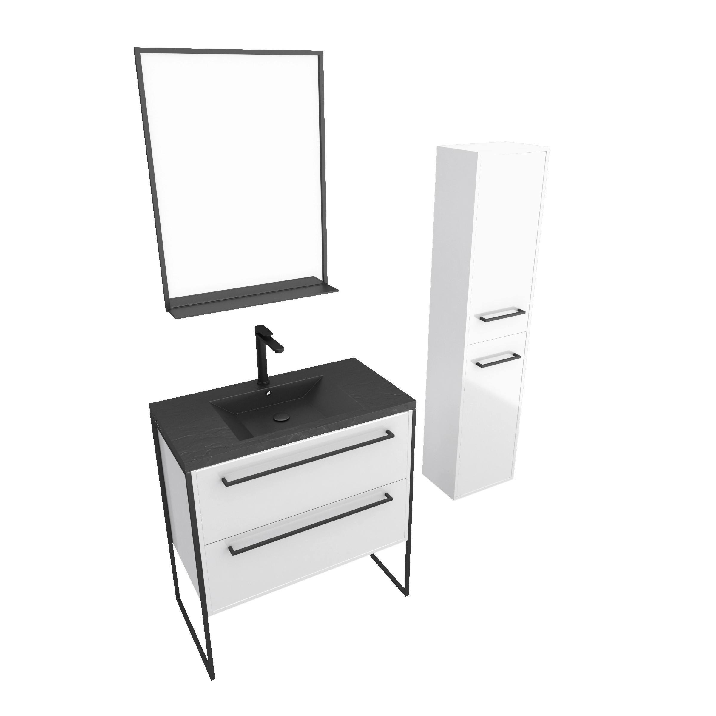 Ce pack comprend un meuble de salle de bain 2 tiroirs une vasque noir effet pierre et un miroir + colonne de rangement laqué blanc (portes blanches). Caractéristiques du meuble :