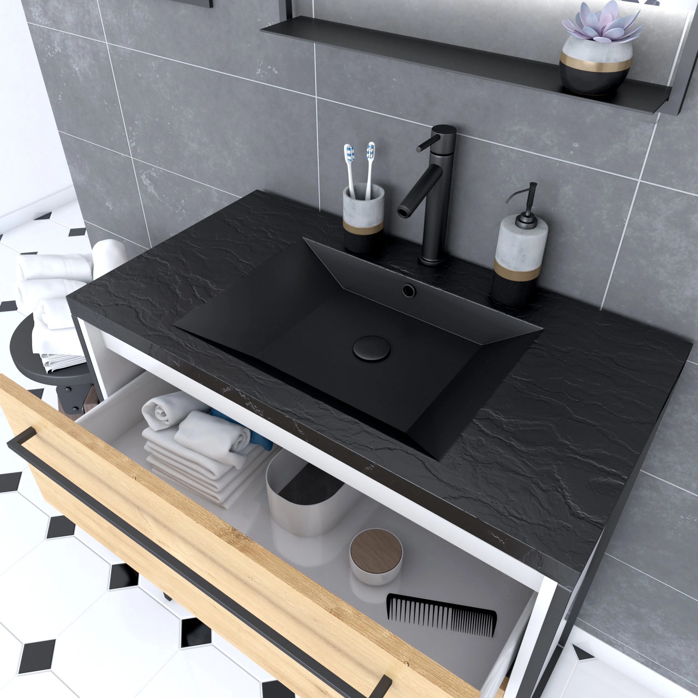 3 avis YUKI Meuble Salle de Bains 80cm 2 Tiroirs Décor Chêne et Noir Cranté - Vasque Blanche Mate - YUKI