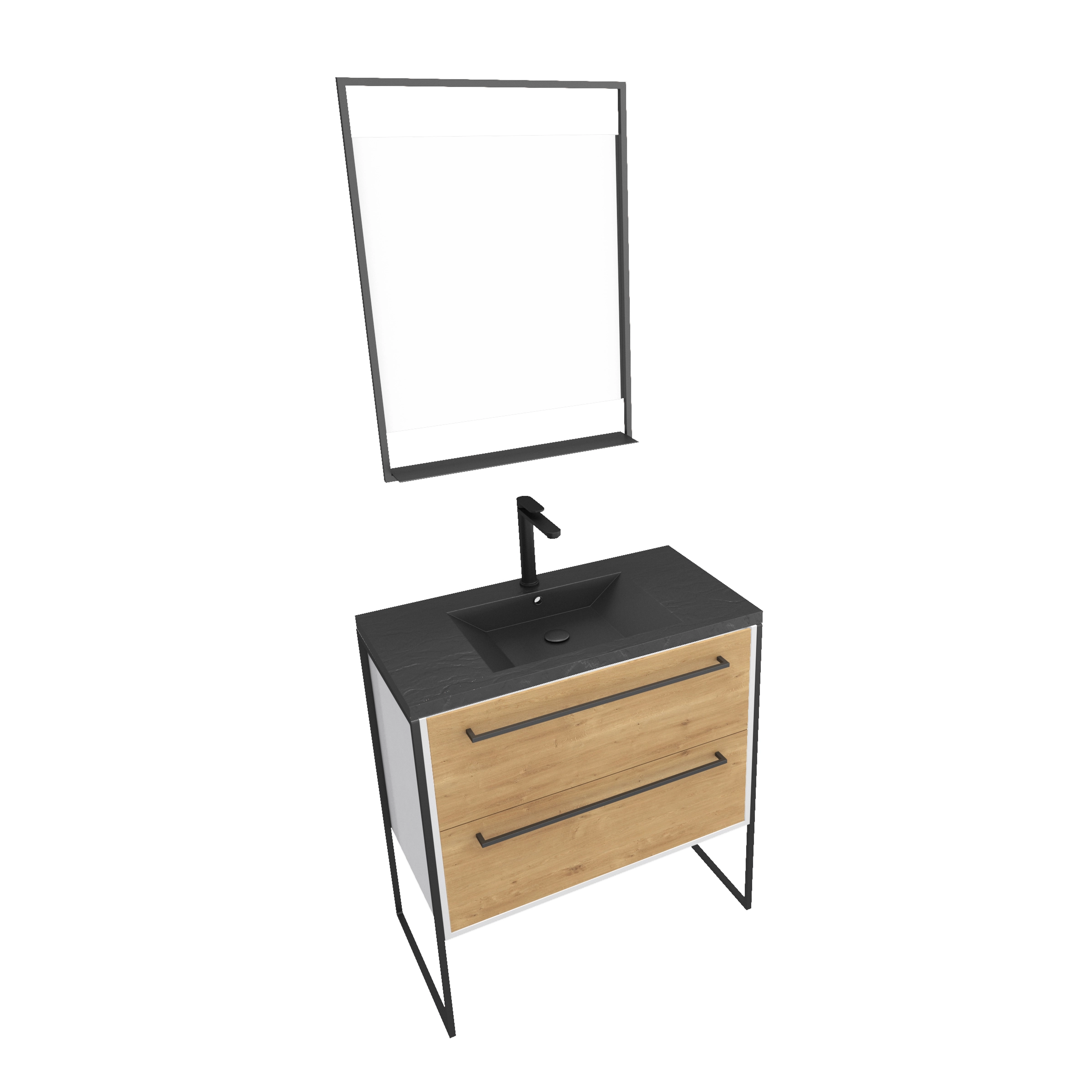 Meuble de salle de bain 80×50 cm + 2 tiroirs chêne naturel + vasque noir effet pierre + miroir led