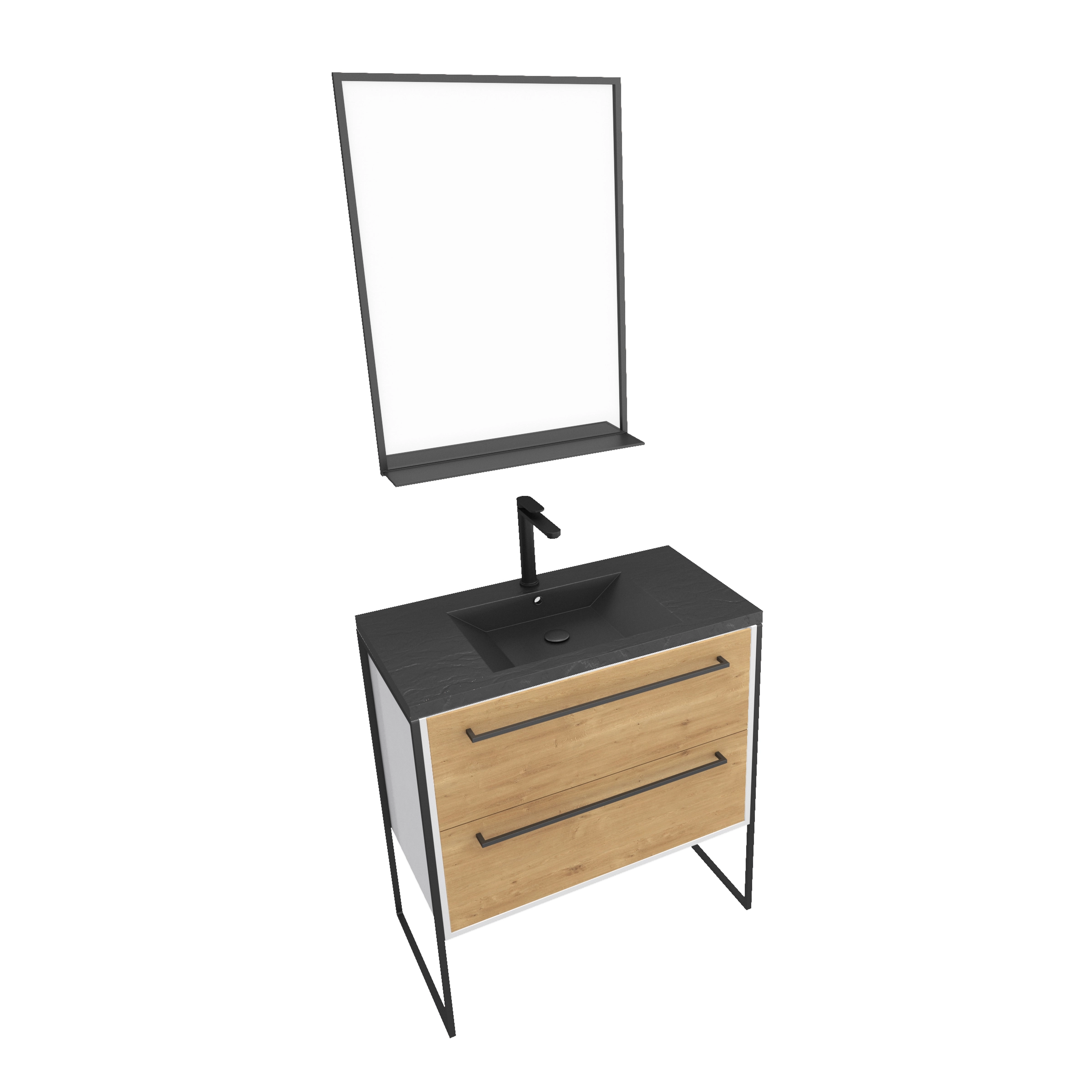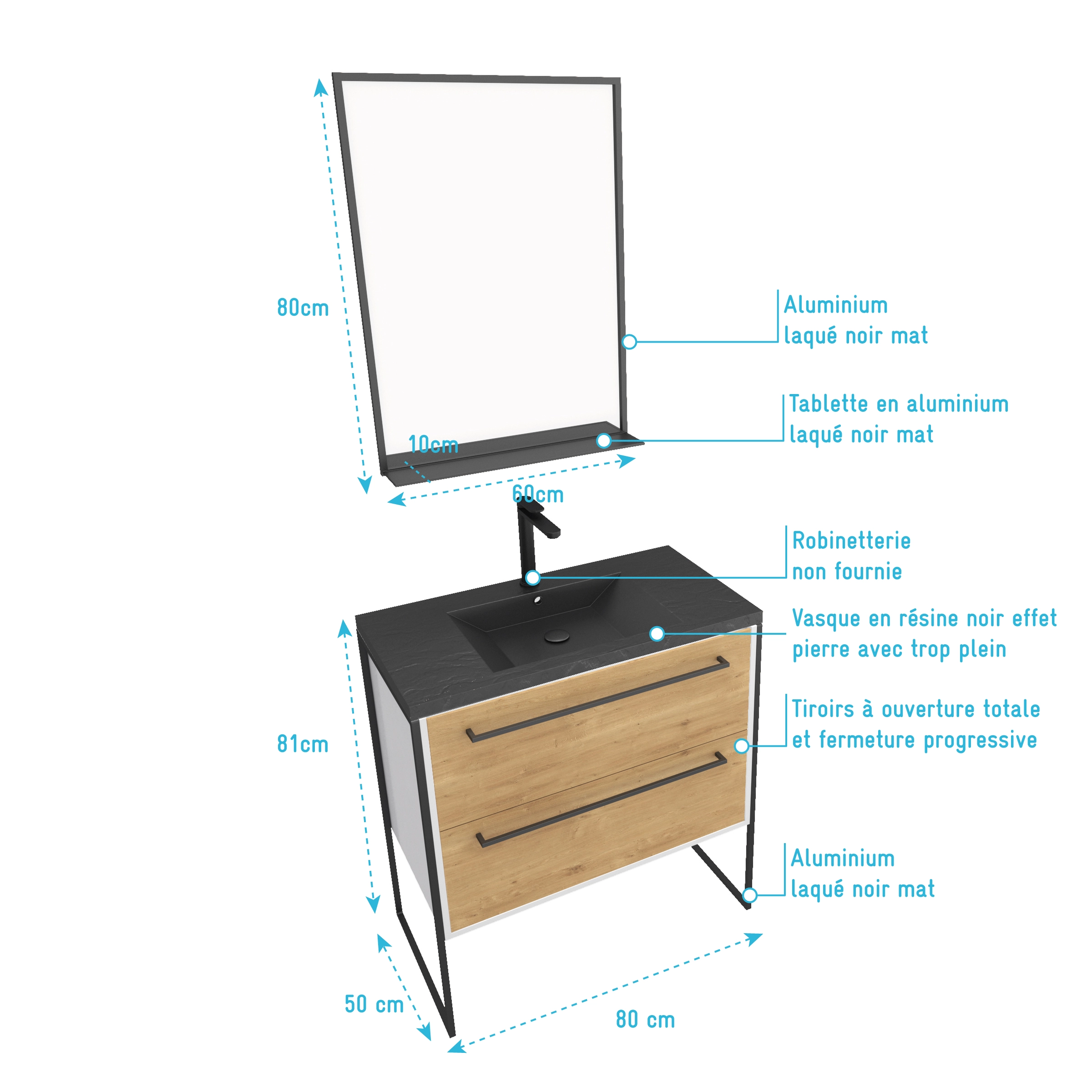 Meuble de salle de bain 80×50 cm + 2 tiroirs chêne naturel + vasque noir effet pierre + miroir noir