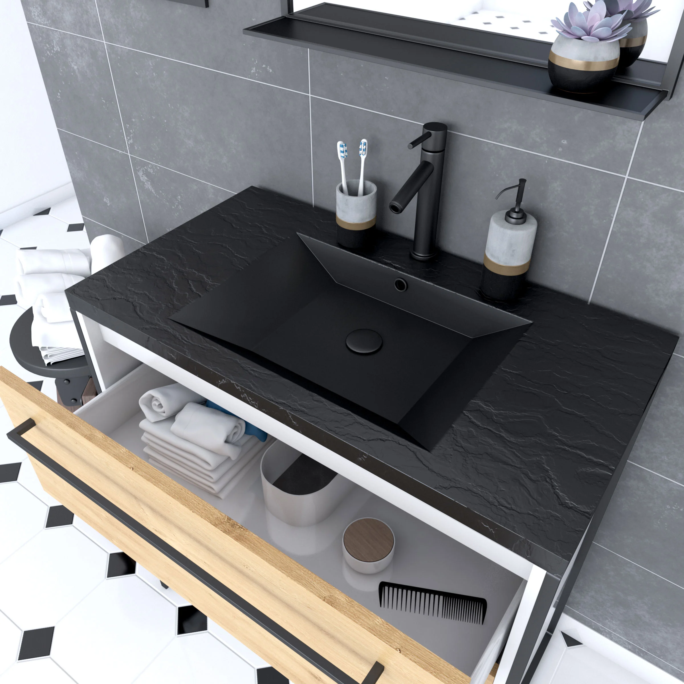 - Plan vasque finition noir effet pierre avec trop plein