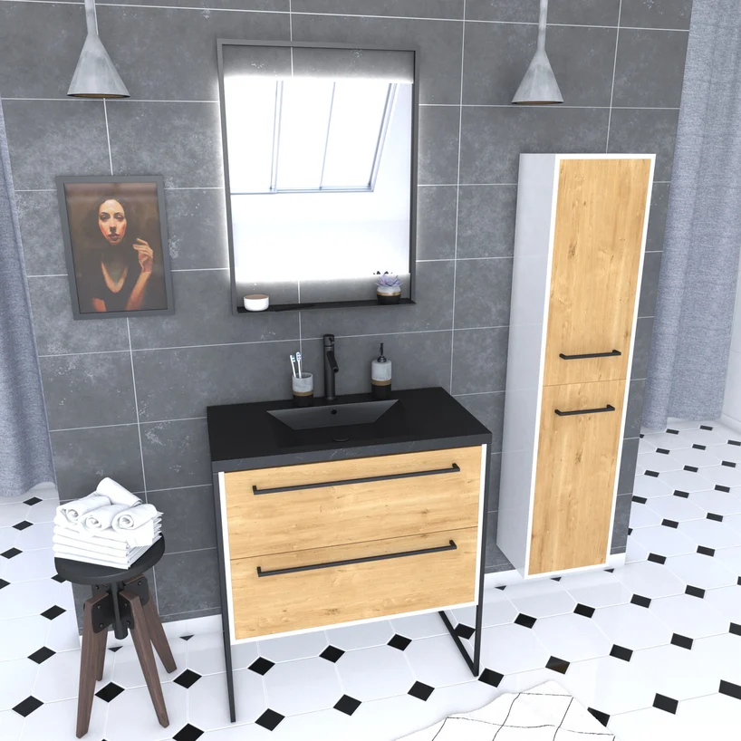 Meuble Salle de Bains 80 cm, Vasque Noire, Miroir Led et Colonne – Blanc et Chêne – STRUCTURA