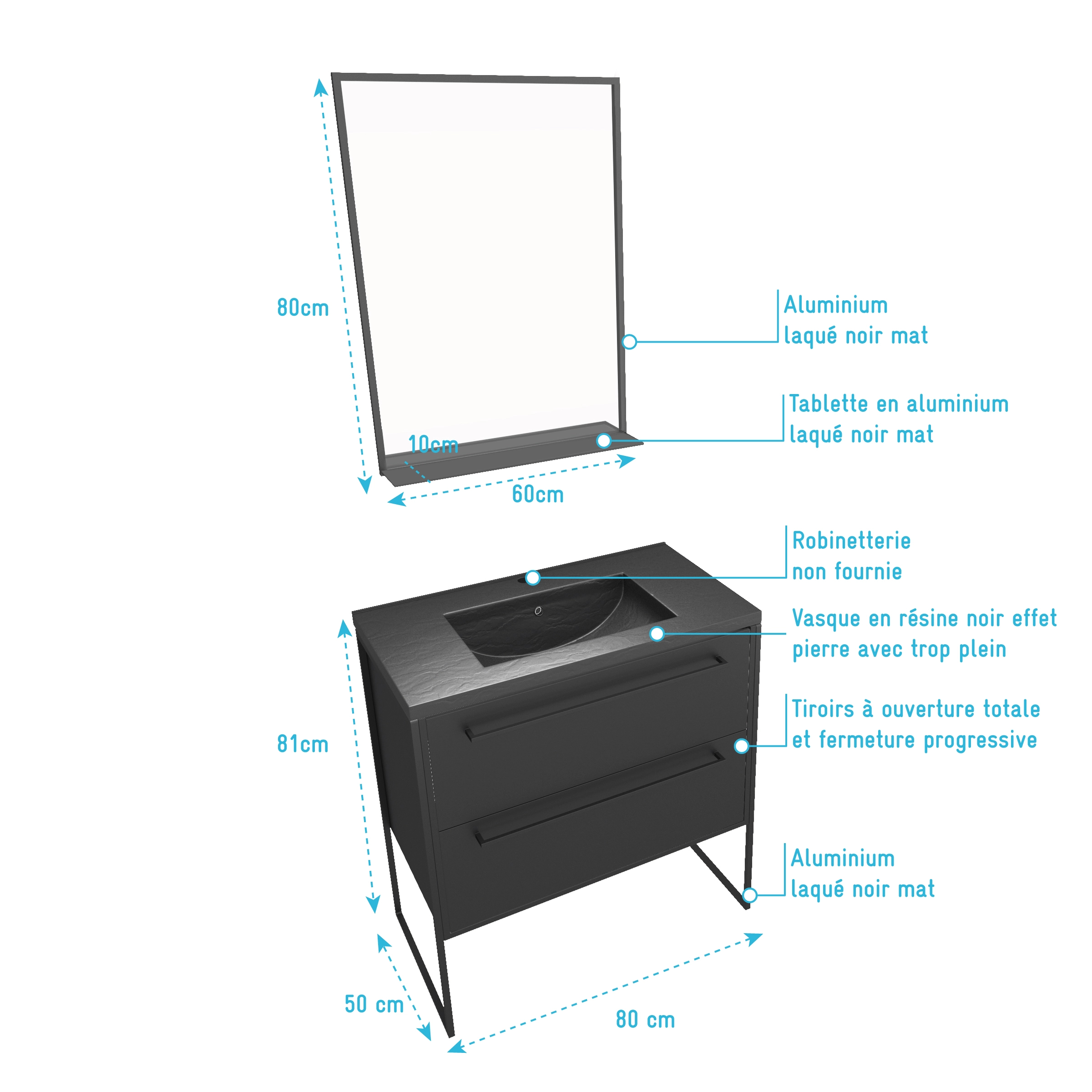 Meuble de salle de bain 80×50 cm – 2 tiroirs noir mat – vasque résine noire effet pierre + miroir