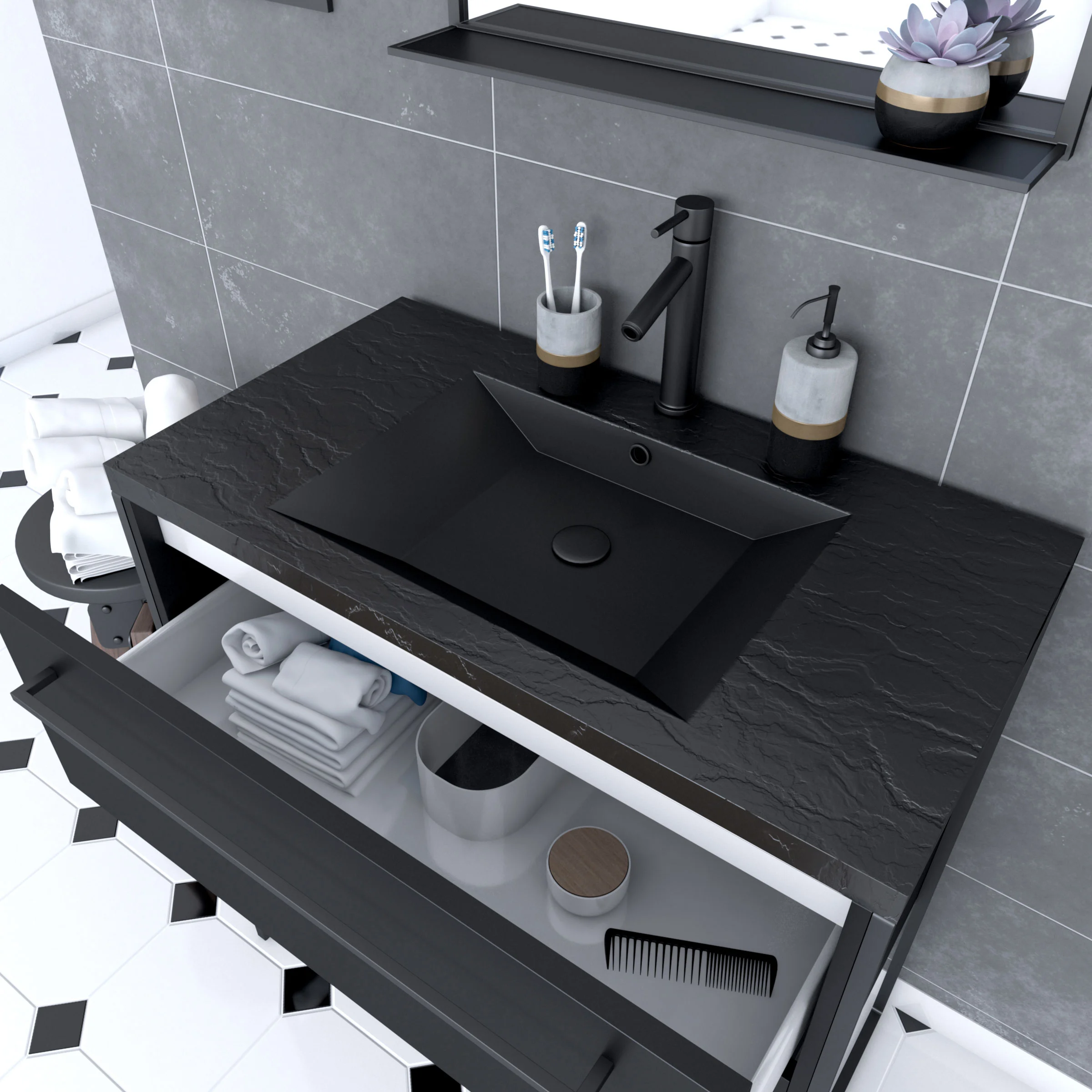 Aménagez votre espace avec ce meuble de salle de salle de bain noir de 80 cm de long, incluant une vasque noire effet pierre et un miroir rectangle.