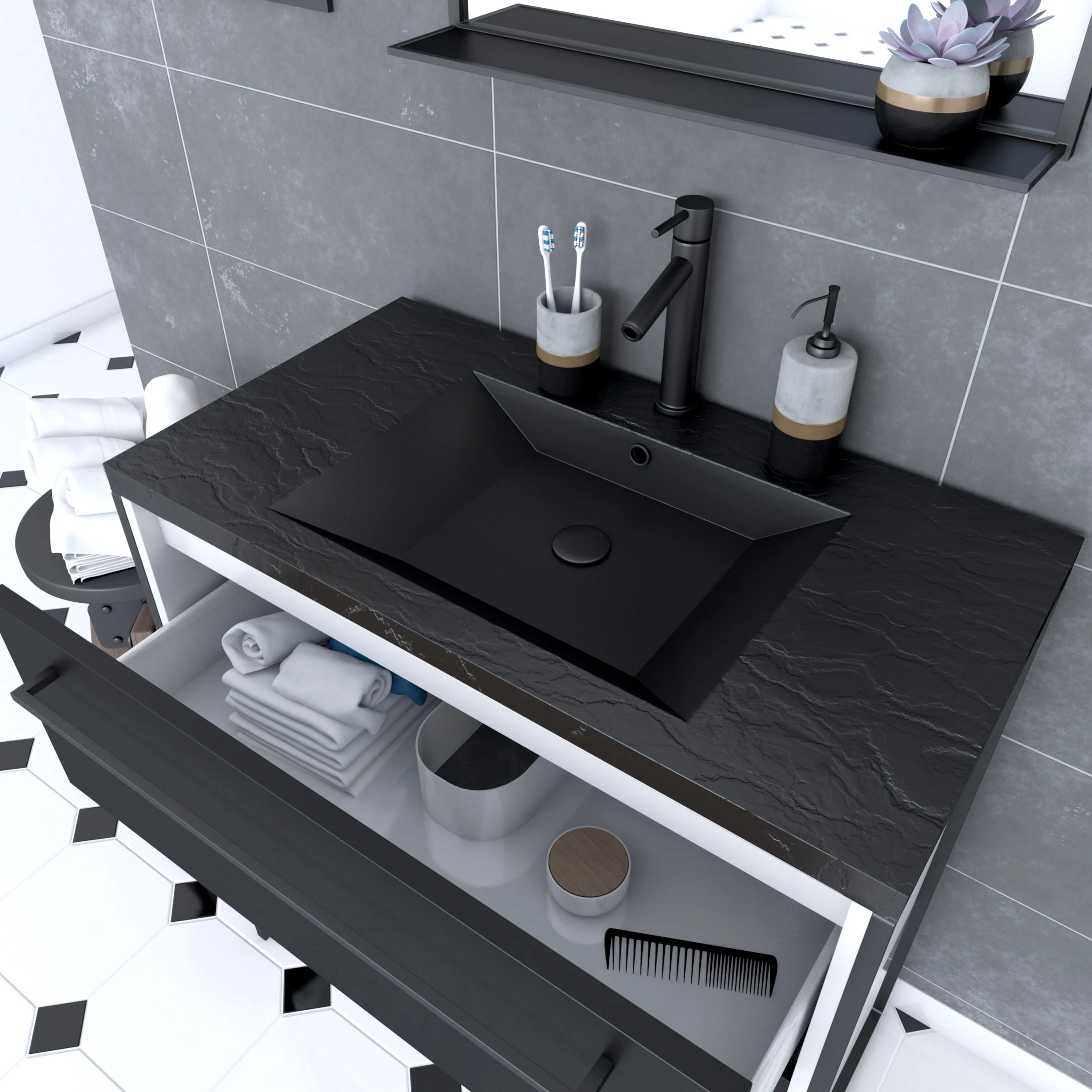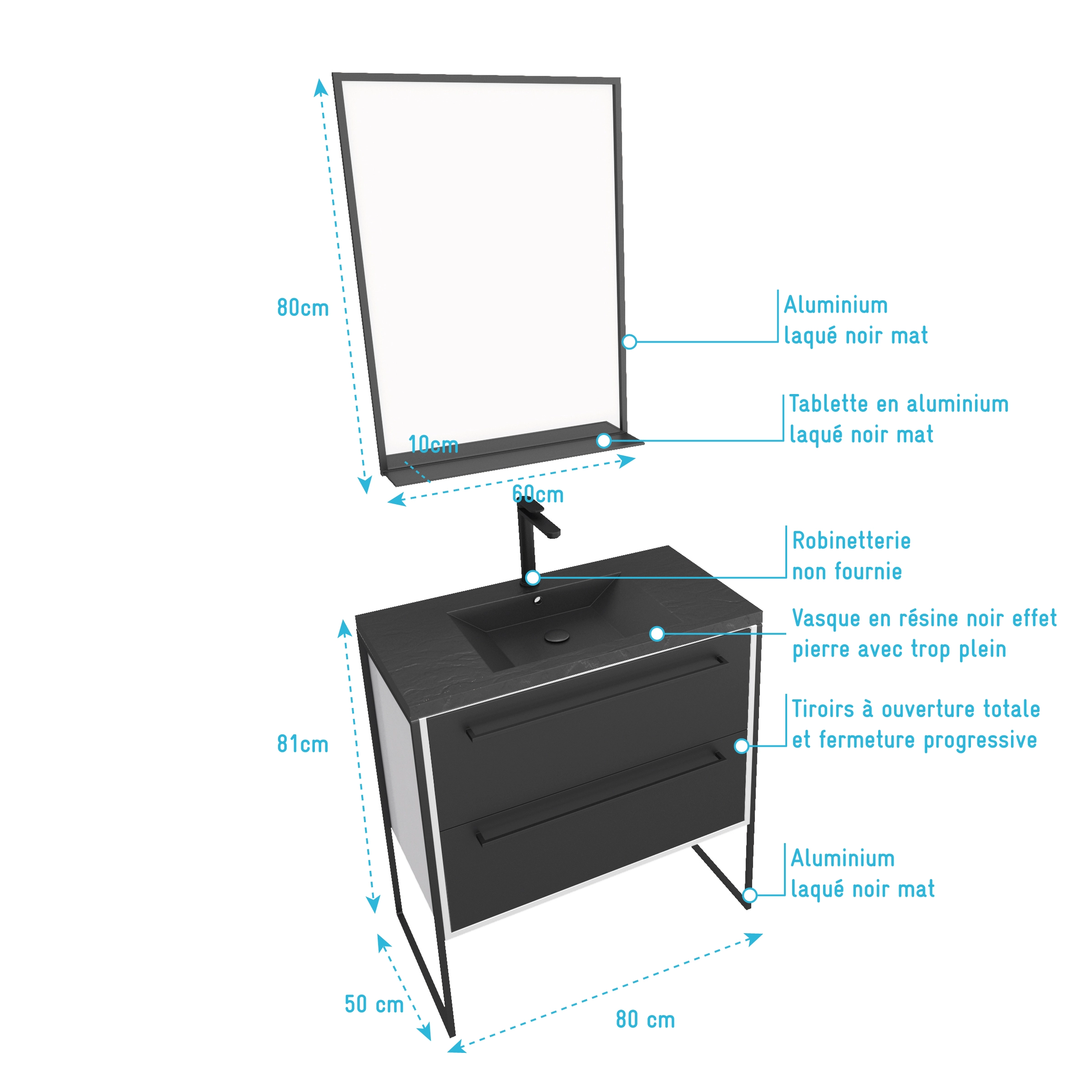 Meuble de salle de bain 80×50 cm Blanc – 2 tiroirs noir mat – vasque noire effet pierre – miroir