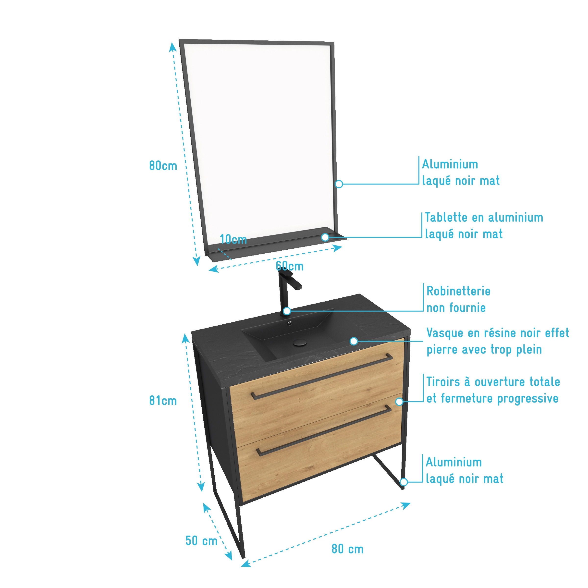 Meuble de salle de bain 80×50 cm NOIR MAT – 2 tiroirs – vasque résine noire effet pierre + miroir