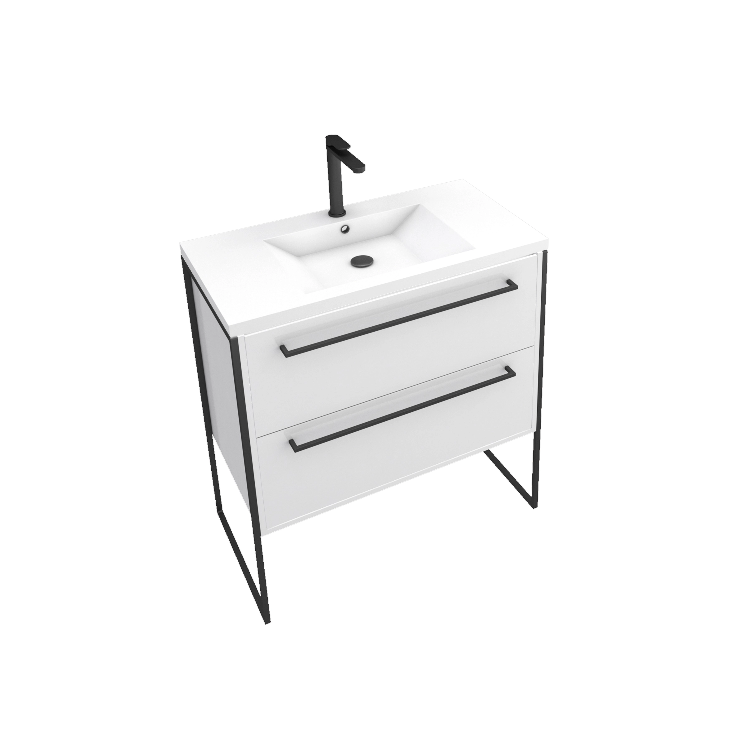 Meuble de salle de bain 80x50cm Blanc – 2 tiroirs – vasque resine blanche – pieds et poignées
