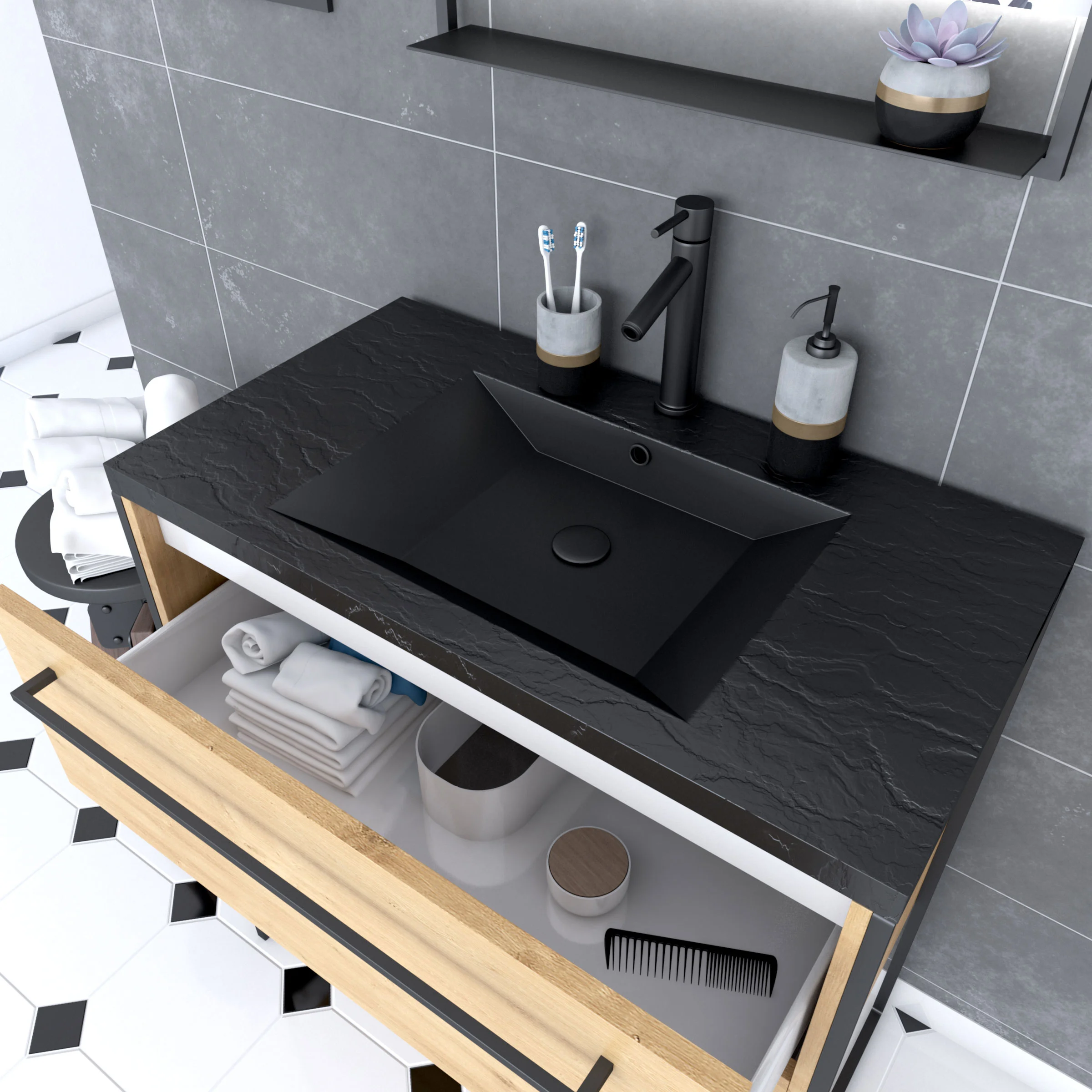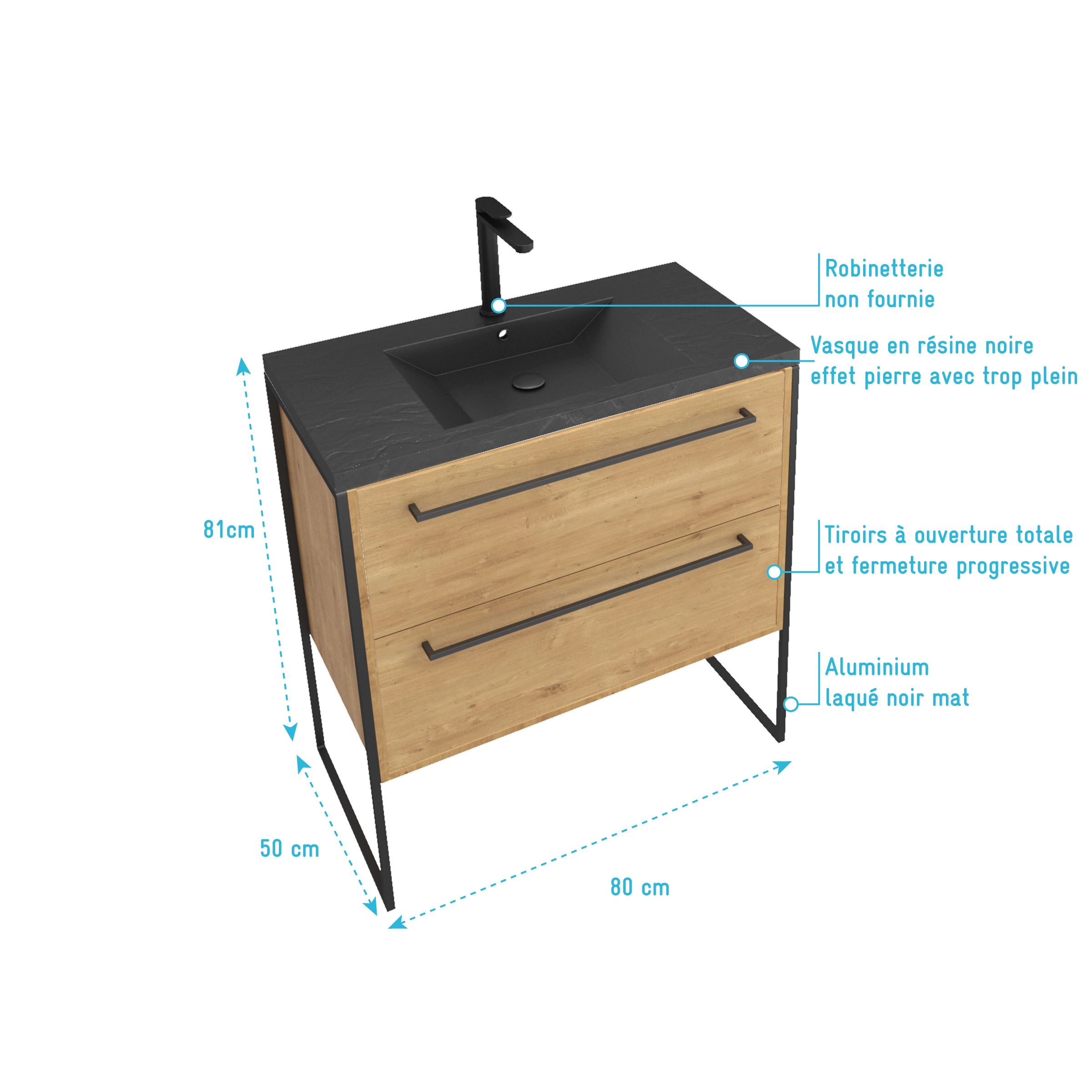 Meuble de salle de bain 80x50cm chêne brun – 2 tiroirs chêne brun- vasque résine noire effet pierre
