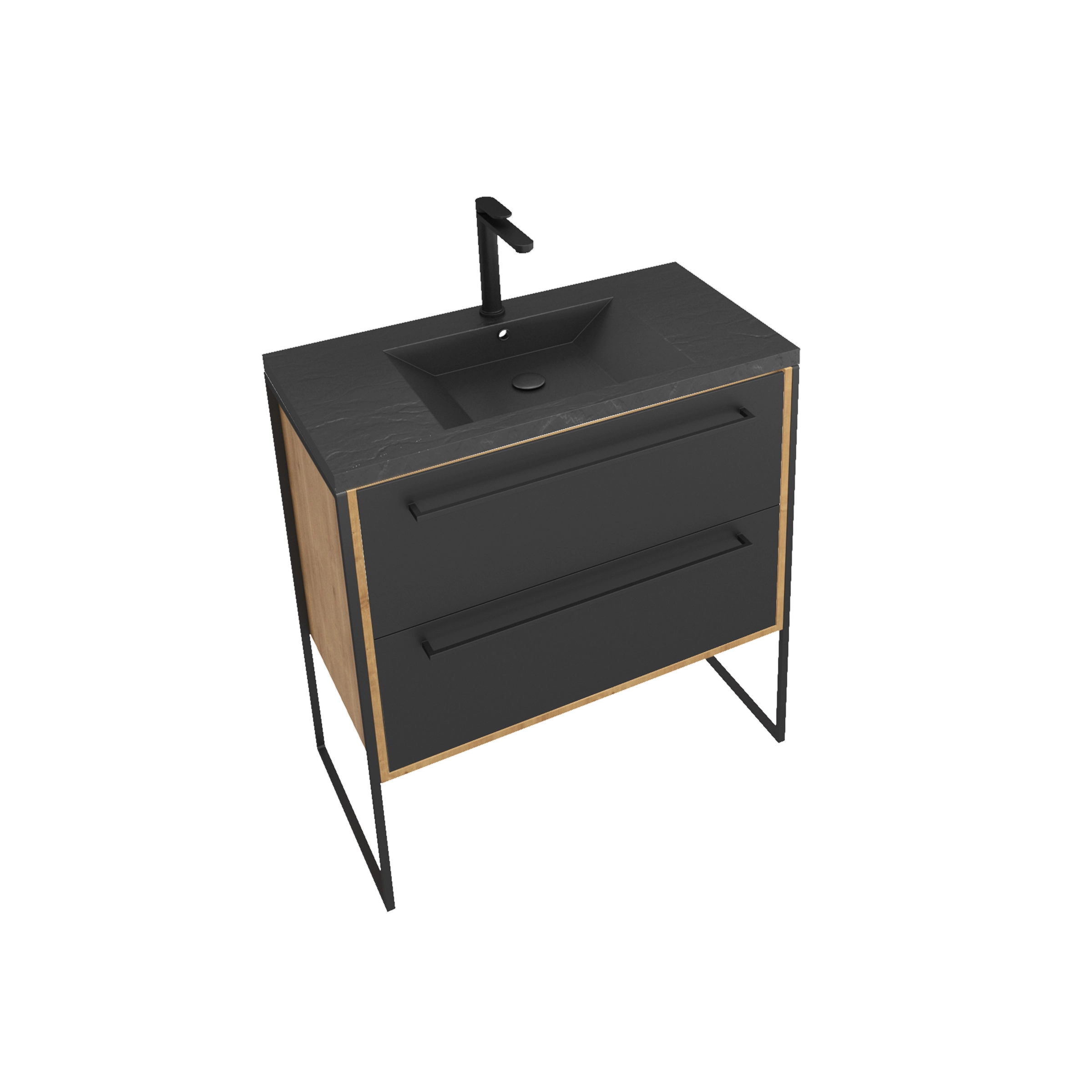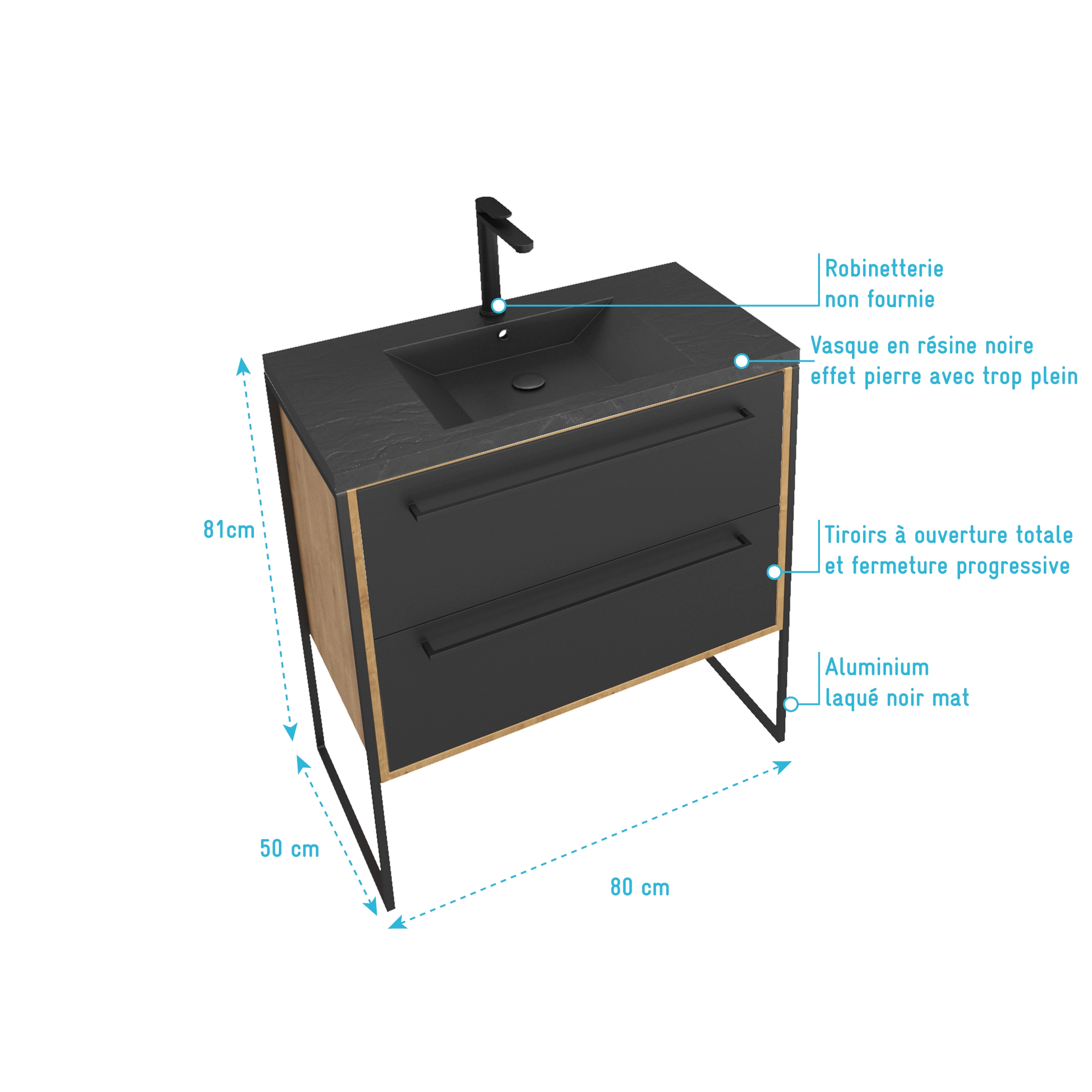 3 avis pour Meuble de salle de bain 80x50cm chene brun – 2 tiroirs noir mat – vasque resine noire effet pierre