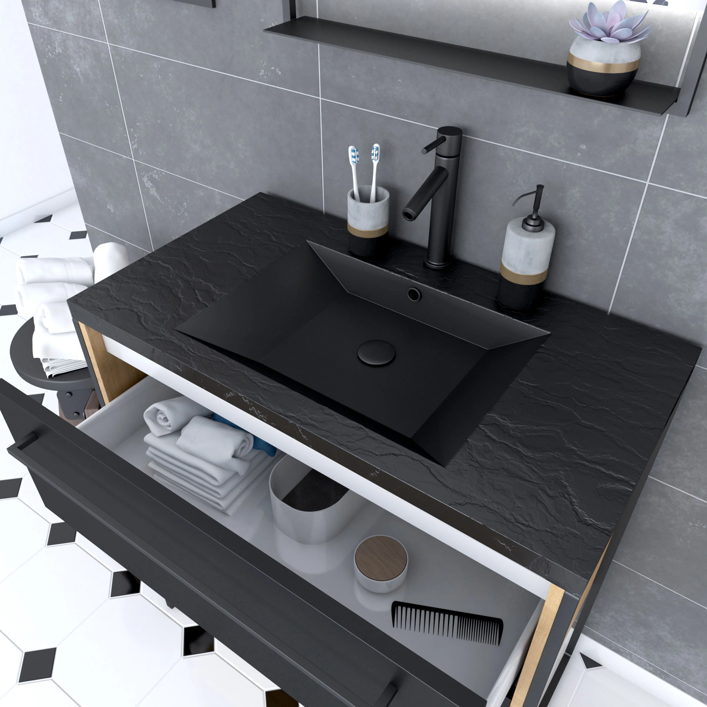 1 avis pour Meuble de salle de bain 80x50cm chene brun – 2 tiroirs – vasque resine noire effet pierre – miroir