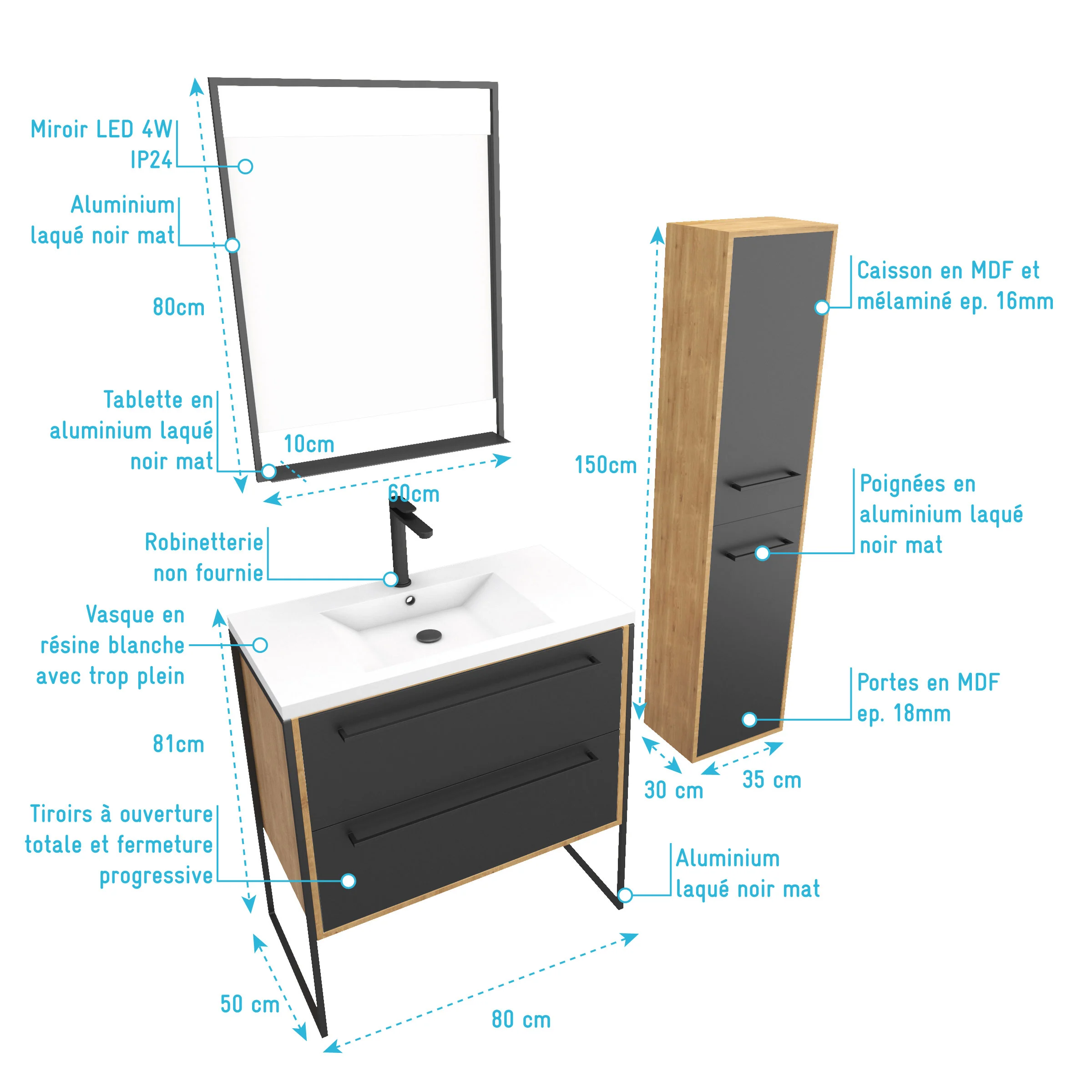 2 avis OMEGA Meuble Salle de Bains 80 cm, Vasque Carrée, Miroir Led et Colonne - Chêne naturel et Noir - UBY