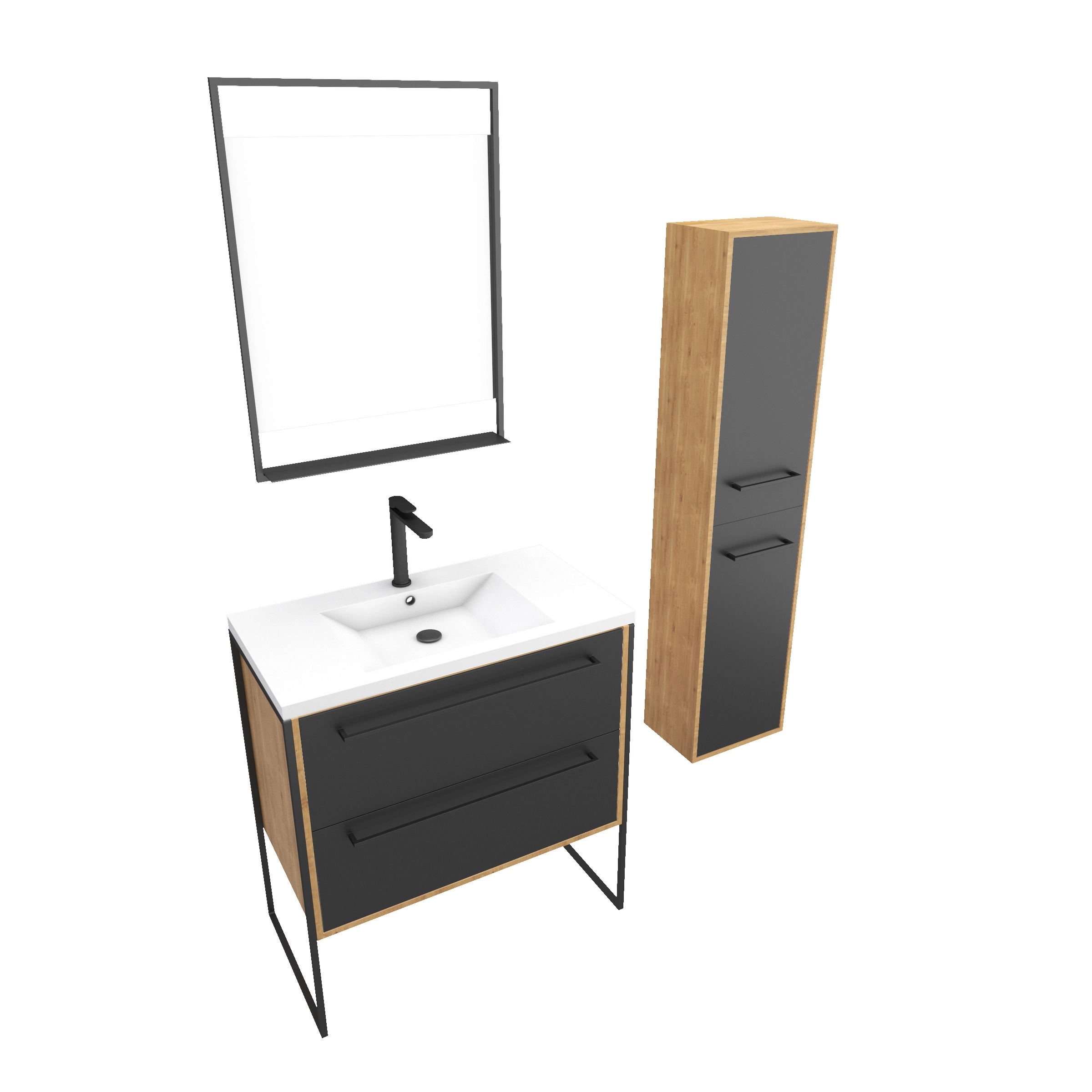 0 avis OMEGA Meuble Salle de Bains 80 cm, Vasque Rectangle, Miroir et Colonne - Chêne naturel et Noir - UBY