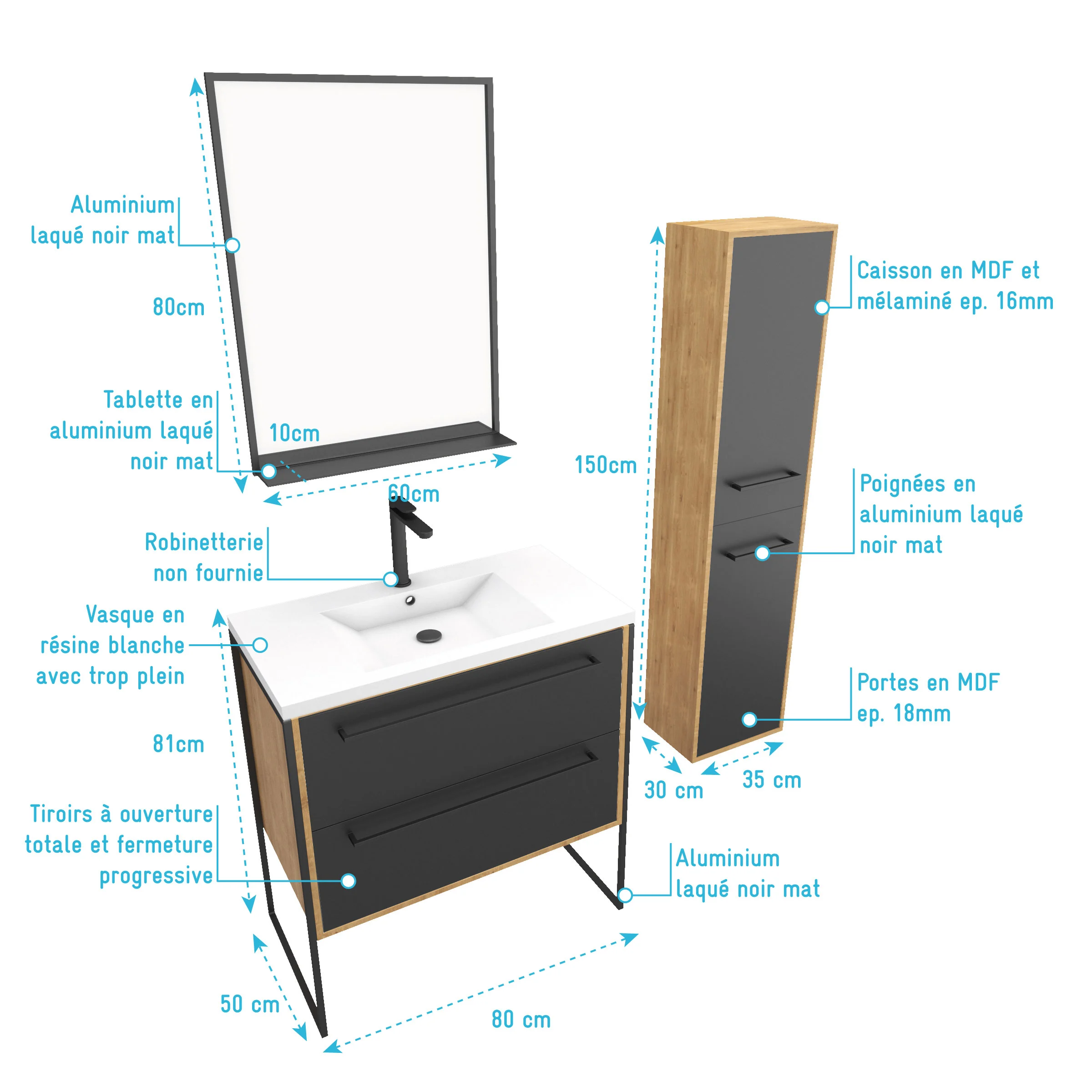 Meuble de salle de bain 80x50cm – vasque blanche 80x50cm -tiroirs noir mat + colonne + miroir