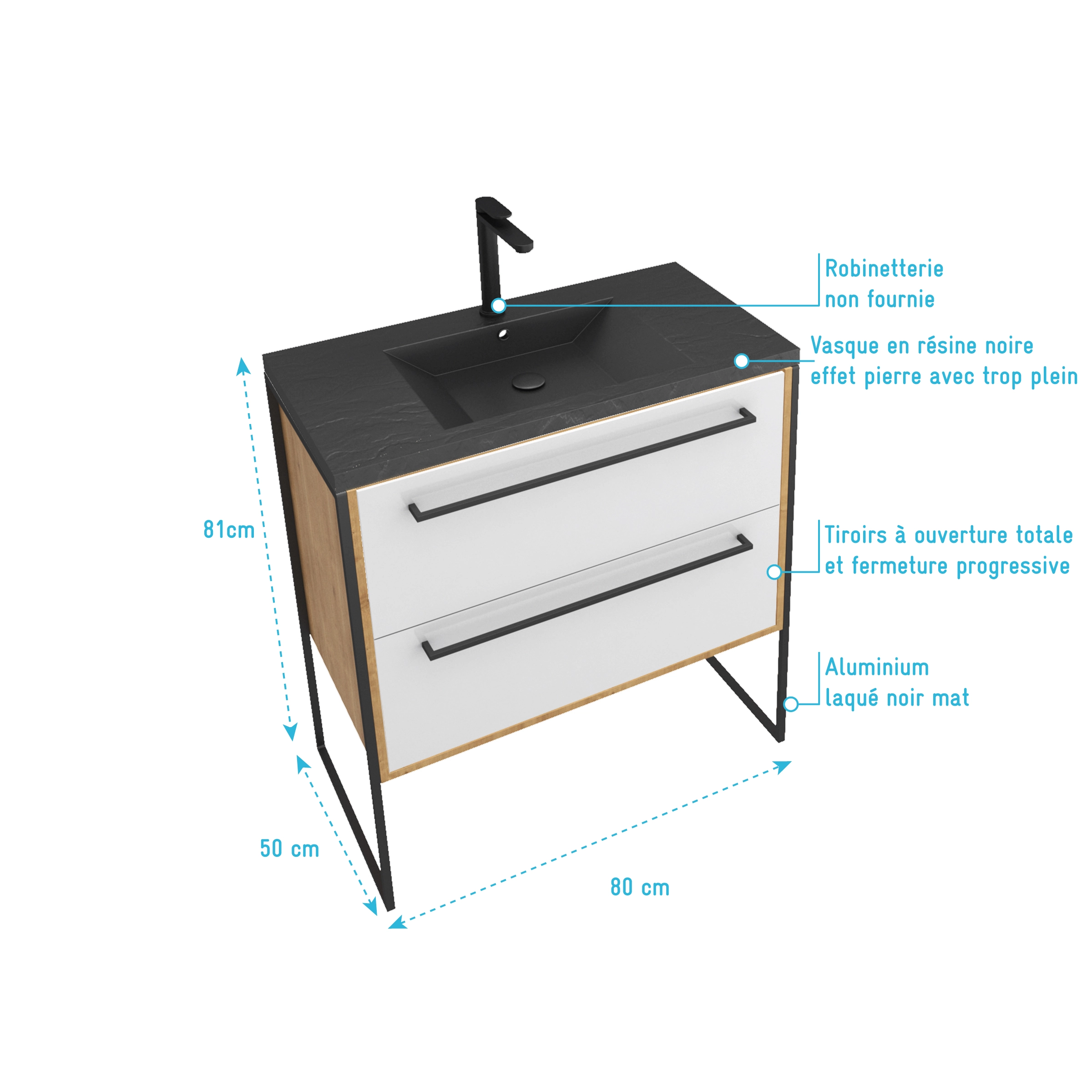3 avis YUKI Meuble Salle de Bains 80cm 2 Tiroirs Décor Chêne et Noir Cranté - Vasque Blanche Mate - YUKI