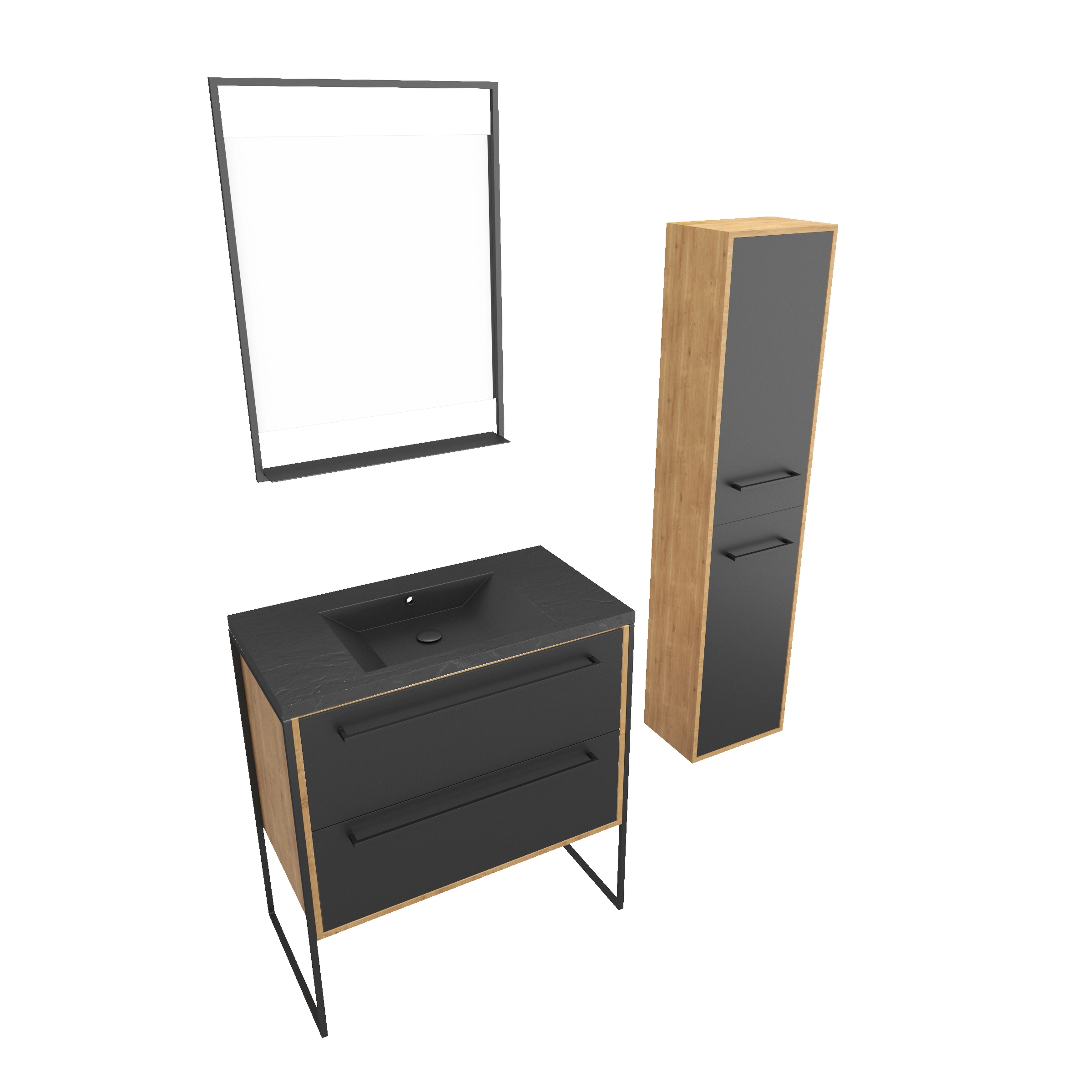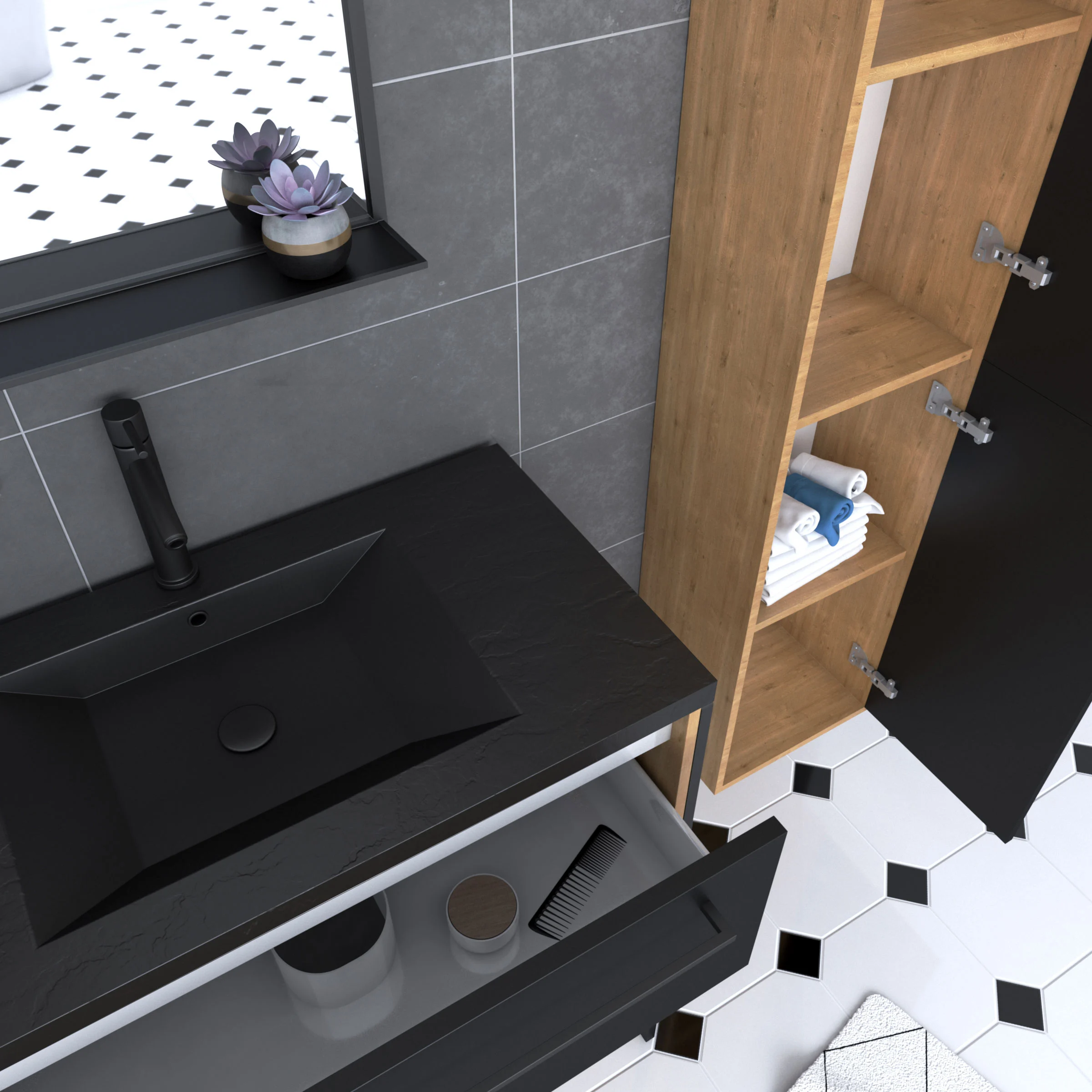 Meuble de salle de bain 80x50cm – vasque noir effet pierre -tiroirs noir mat + colonne + mirroir
