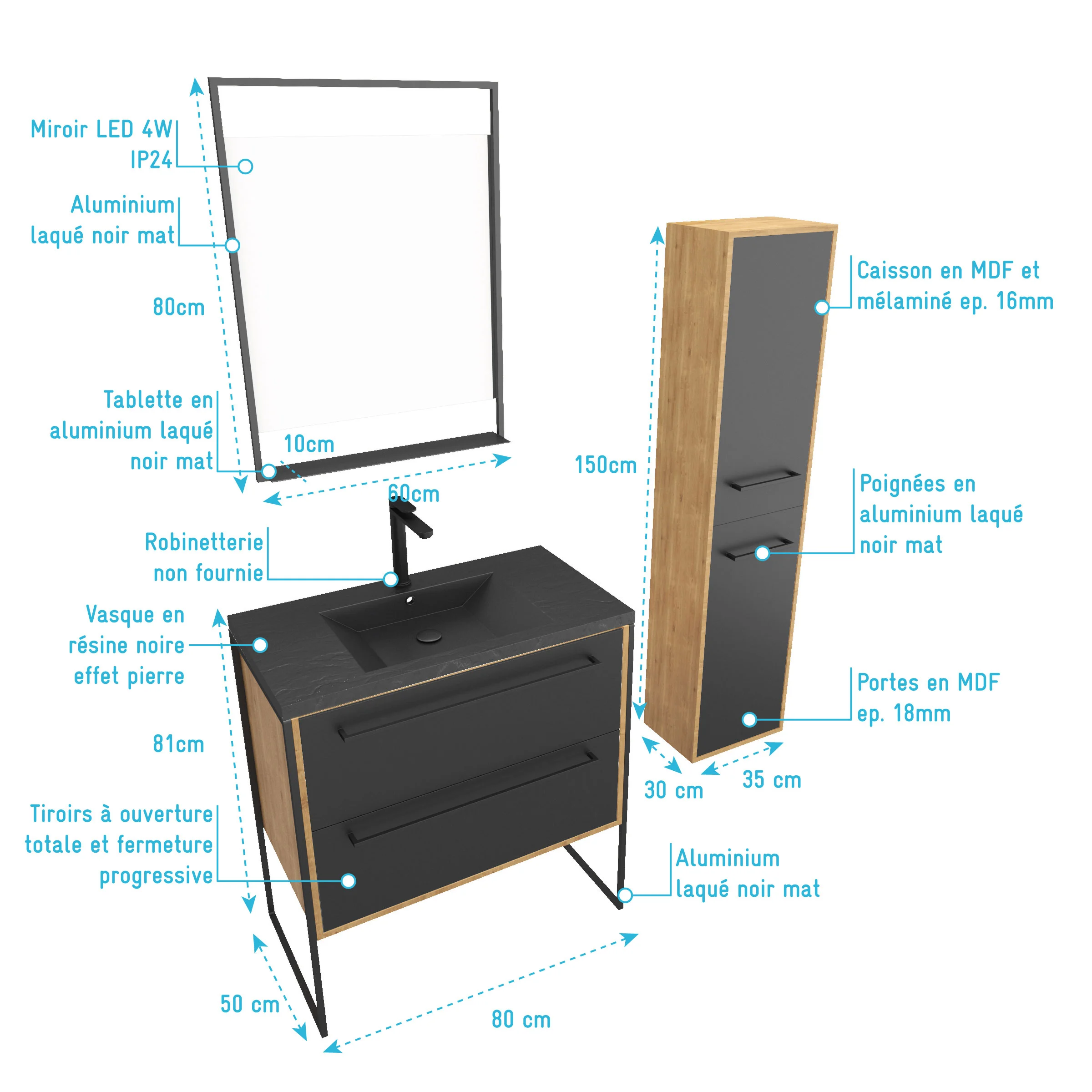 2 avis OMEGA Meuble Salle de Bains 80 cm, Vasque Carrée, Miroir Led et Colonne - Chêne naturel et Noir - UBY