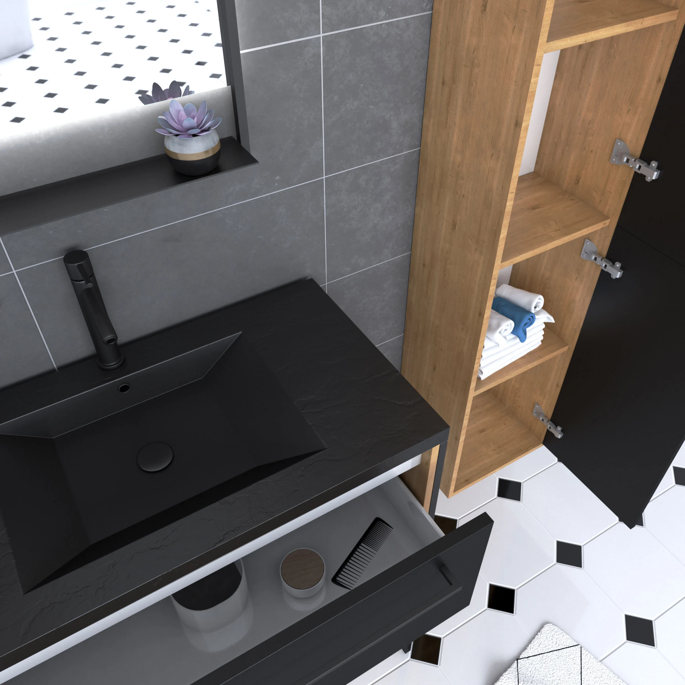 0 avis Meuble de salle de bain 80x50cm - vasque noir effet pierre -tiroirs noir mat + colonne + mirroir