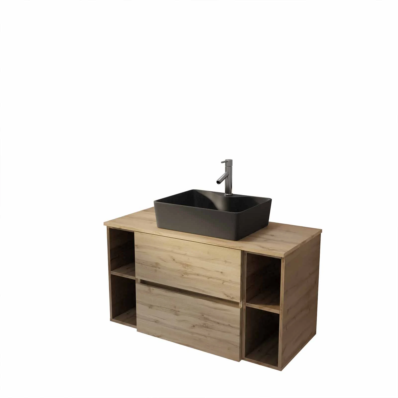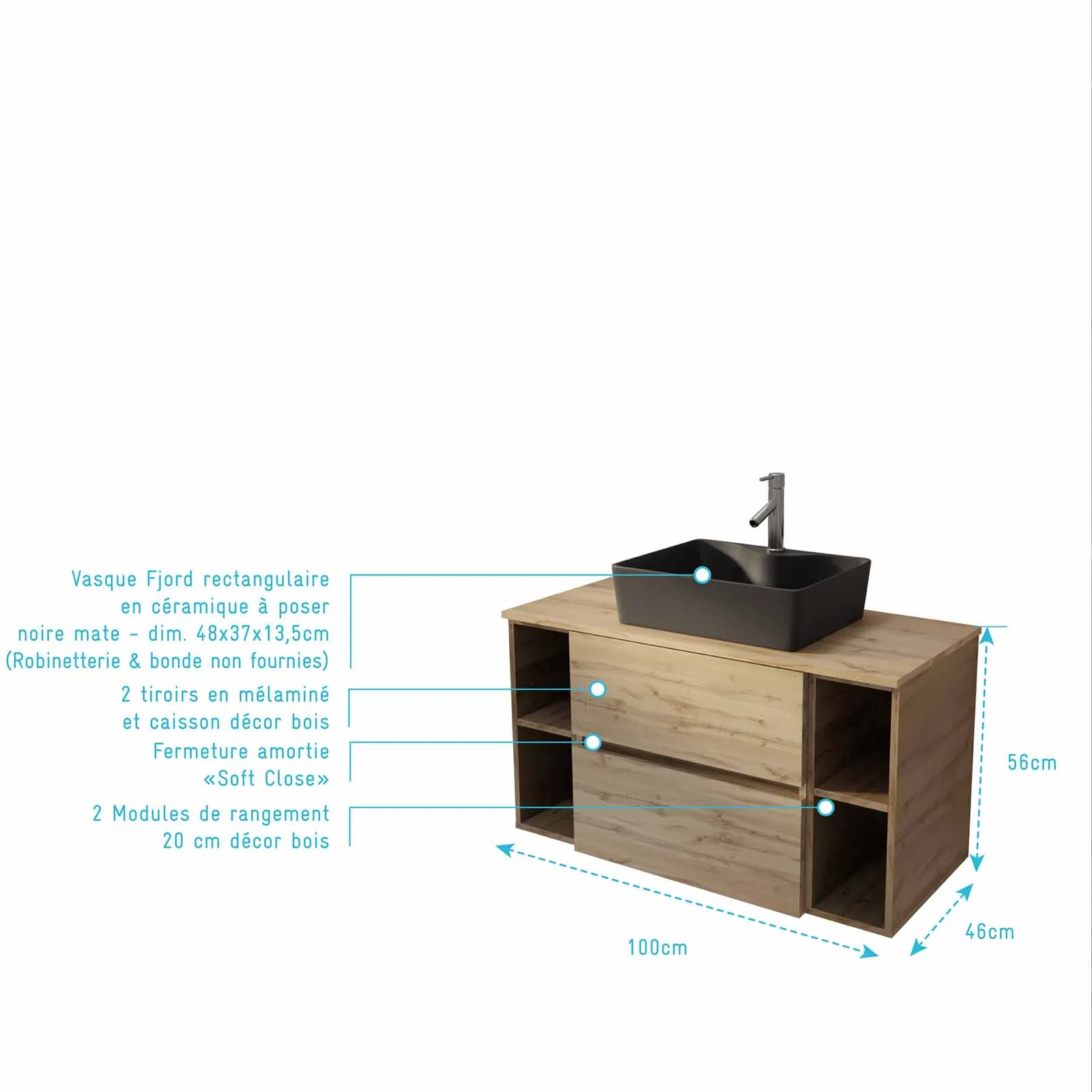Meuble de salle de bains 100cm TIMBER Décor Chêne 2 Tiroirs – Vasque Rectangulaire Noire