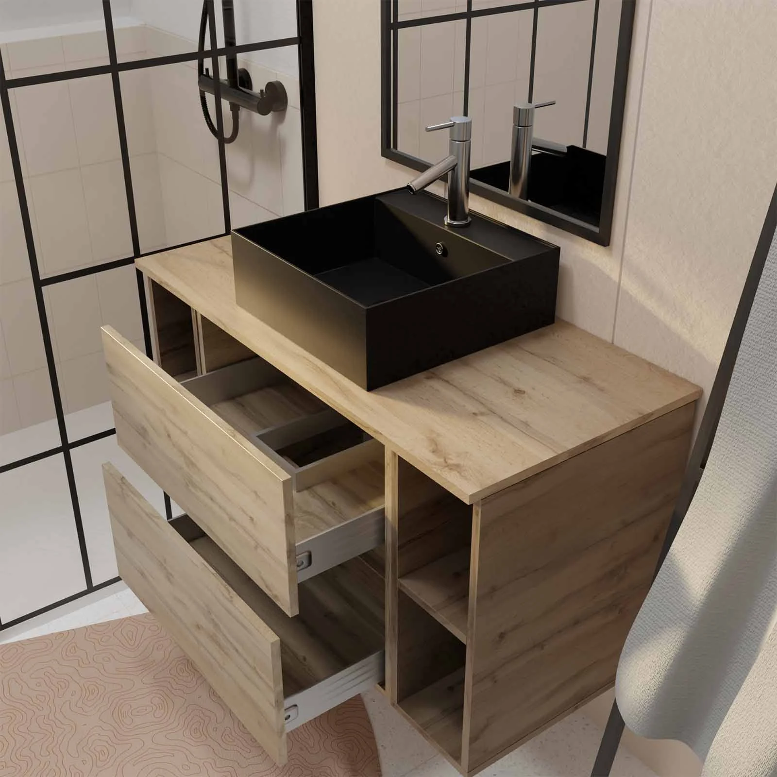 • Meuble de salle de bains 100cm TIMBER Décor Chêne 2 Tiroirs - Vasque Rectangulaire Noire