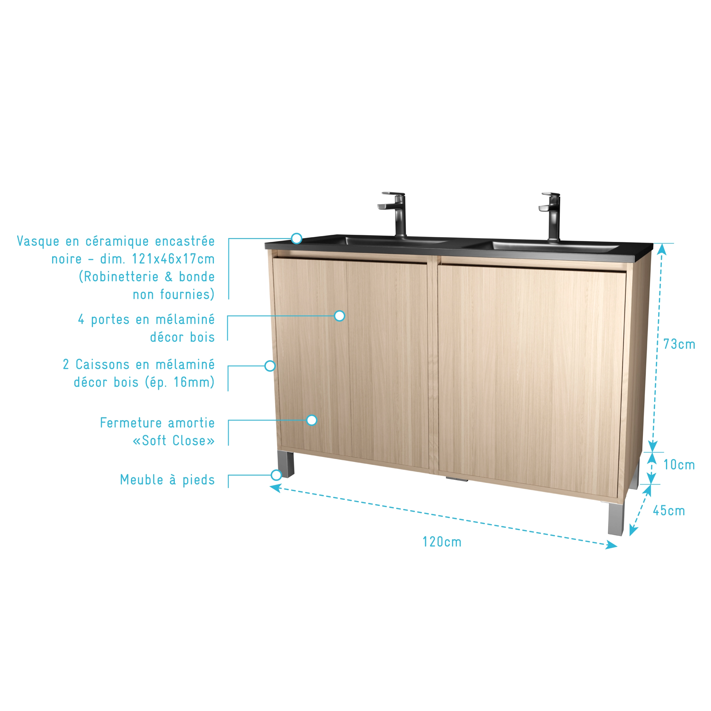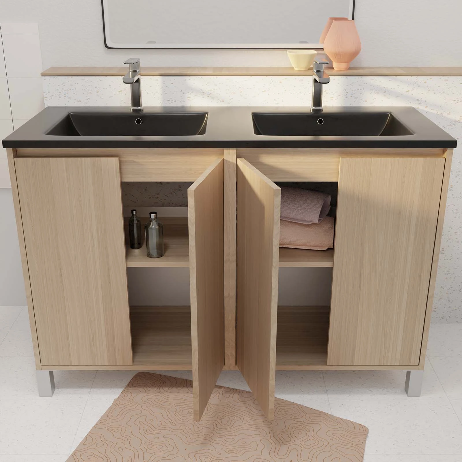 Meuble de salle de bains 120 cm 4 Portes Chêne Clair + Vasque Double Céramique Noire – XENOS