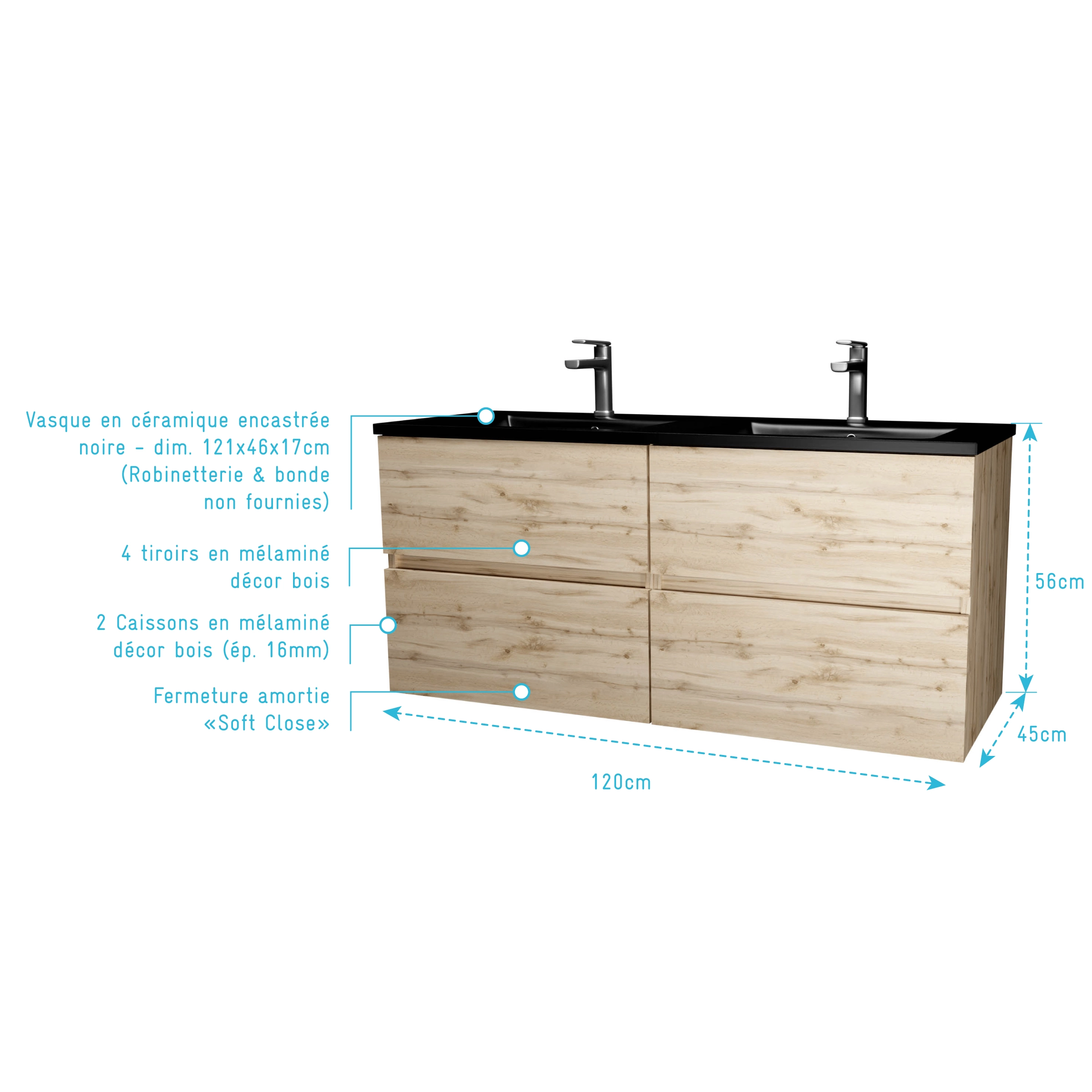 Meuble de salle de bains 120 cm 4 Tiroirs Chêne Naturel + Vasque Double Céramique Noire – TIMBER
