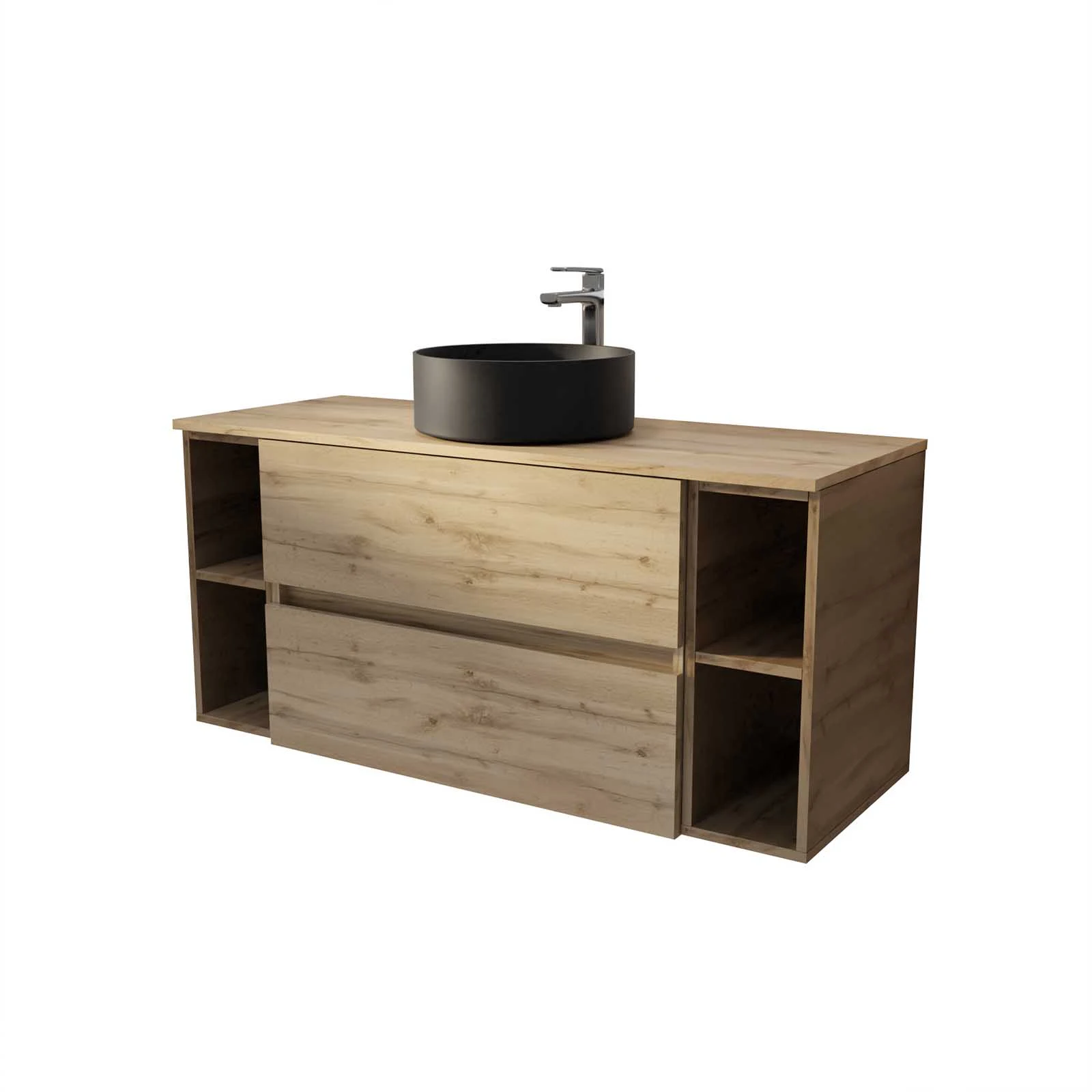 Meuble de salle de bains 120 cm TIMBER - Décor Chêne, 2 tiroirs, Vasque noire à poser