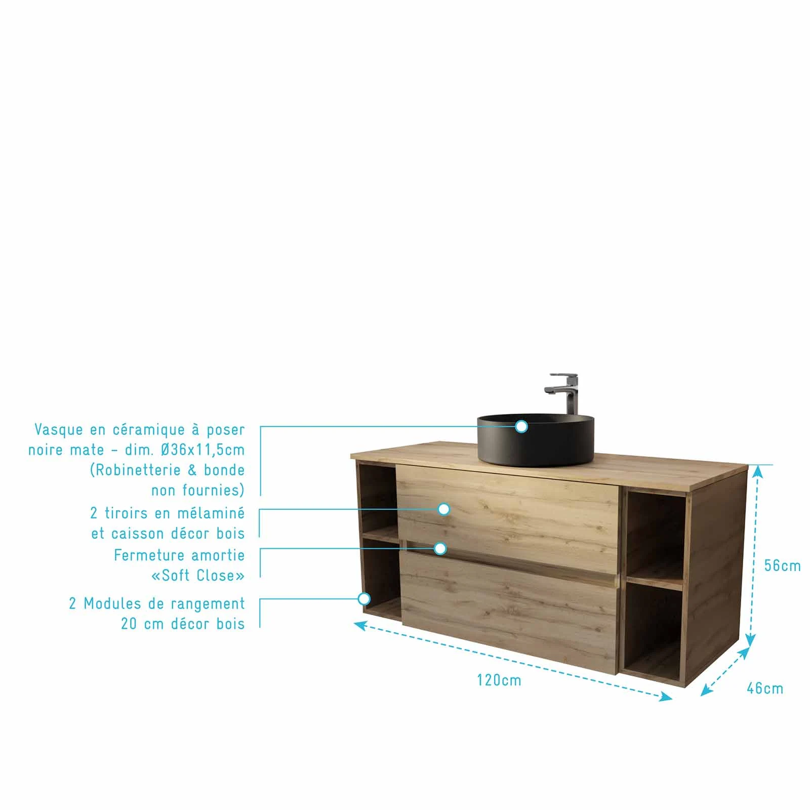 Meuble de salle de bains 120 cm TIMBER – Décor Chêne, 2 tiroirs, Vasque noire à poser