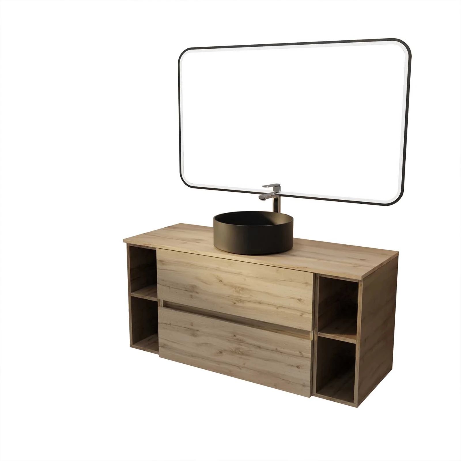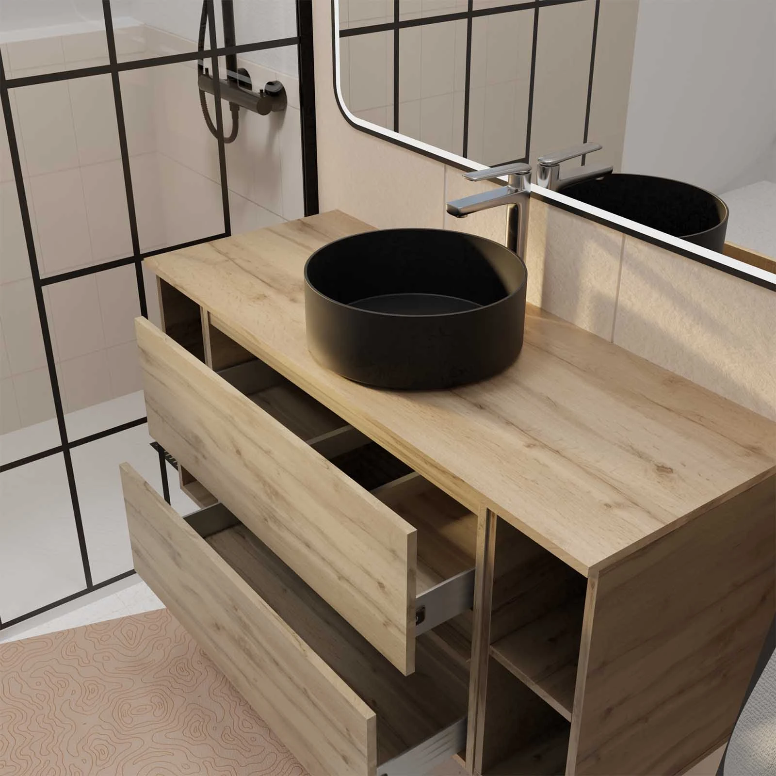 Meuble de salle de bains 120 TIMBER Décor Chêne 2 tiroirs – Vasque noire à poser Miroir LED 120×70