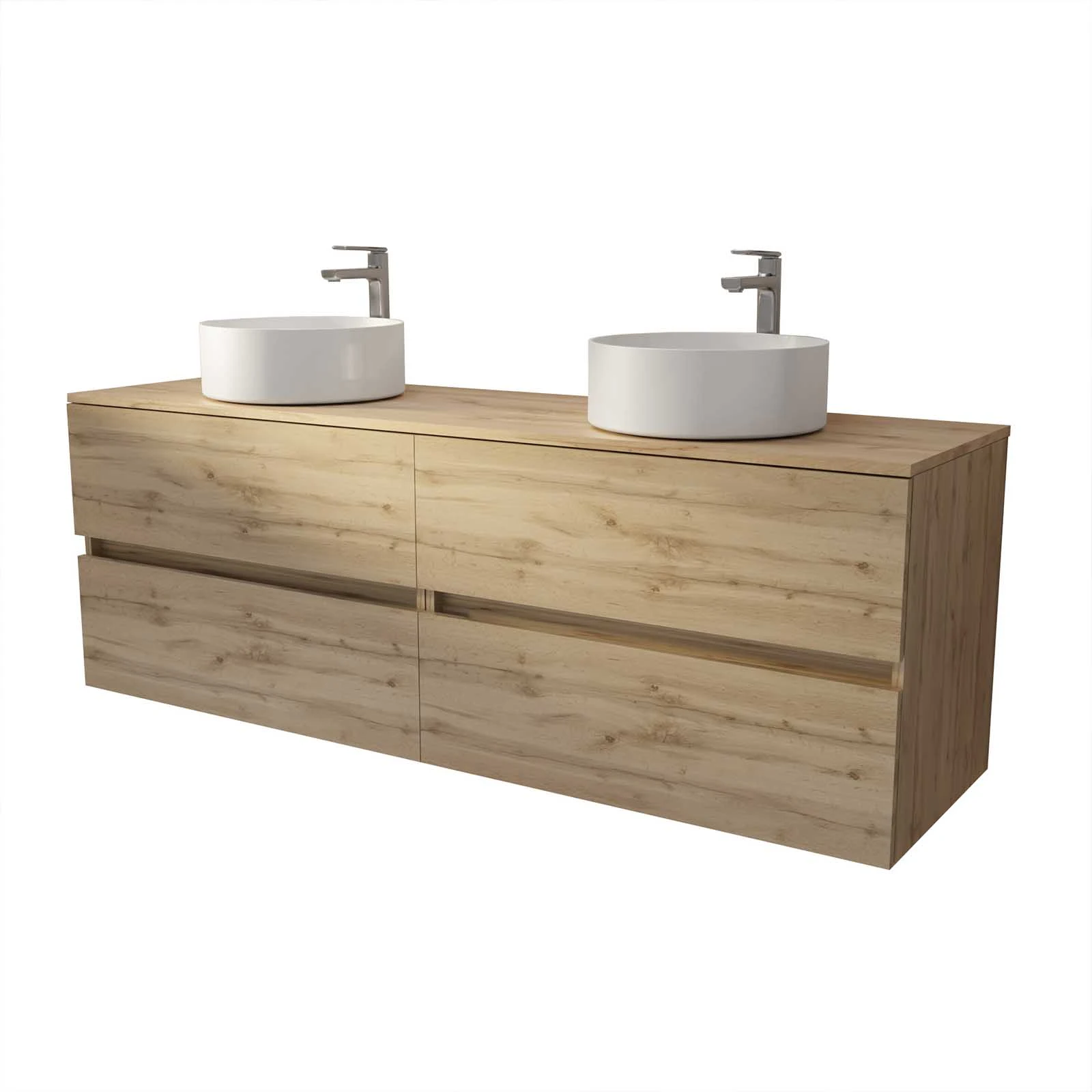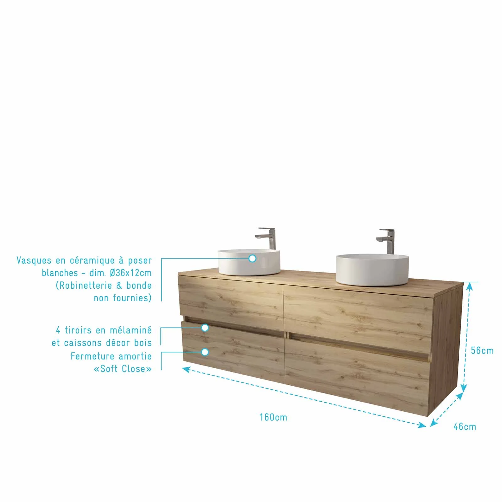 Meuble de salle de bains 160 TIMBER Décor Chêne – 4 Tiroirs – 2 Vasques Rondes Blanches