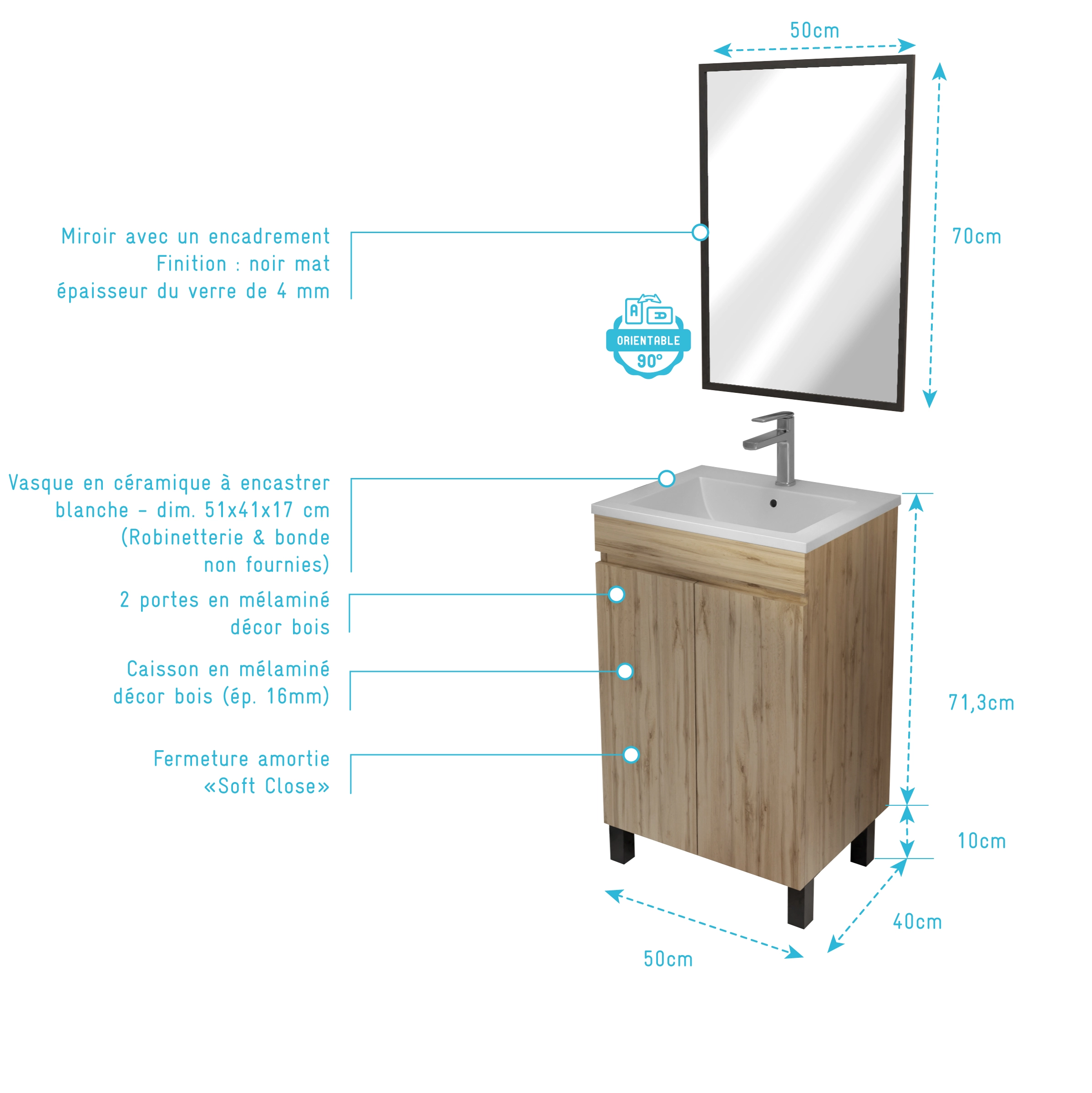 Meuble de Salle de Bains 50 cm Décor Chêne Naturel – Vasque Blanche et Miroir 50×70 avec Cadre Noir