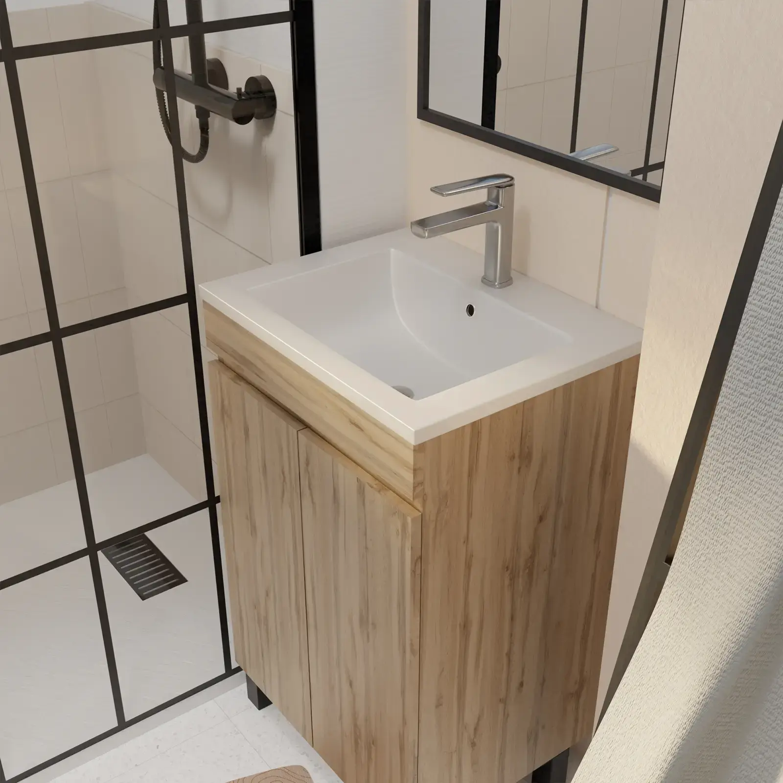 Ce meuble associe un caisson en mélaminé décor bois et une vasque en céramique blanche à encastrer, pour un style moderne et épuré. Ses deux portes avec fermeture amortie Soft Close assurent une utilisation silencieuse et agréable. Un design à la fois pratique et esthétique, idéal pour les petites salles de bains.