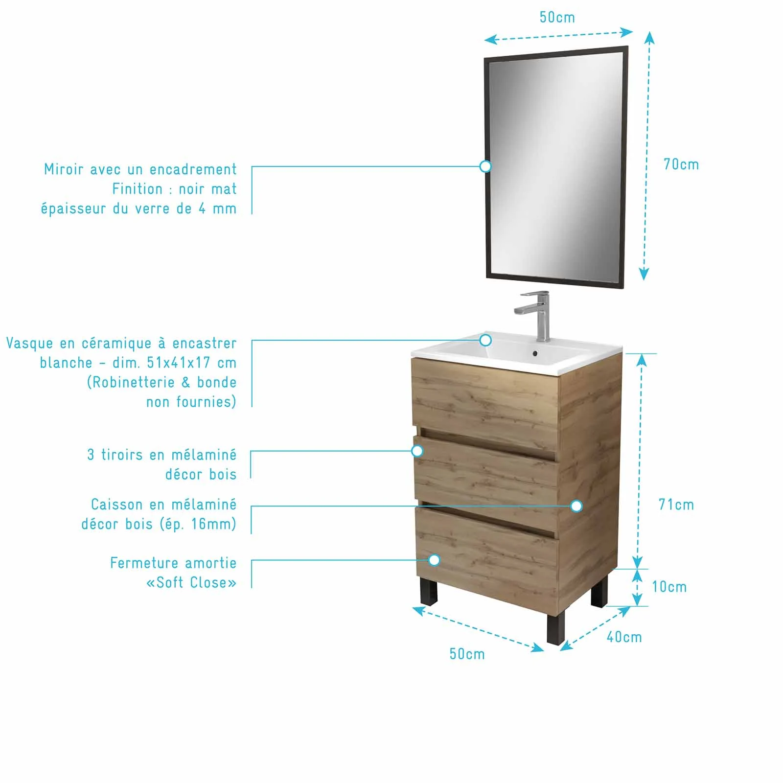 0 avis TIMBER Meuble de Salle de Bains 50cm TIMBER - 3 Tiroirs Décor Chêne - Vasque Blanche et Miroir Cadre Noir
