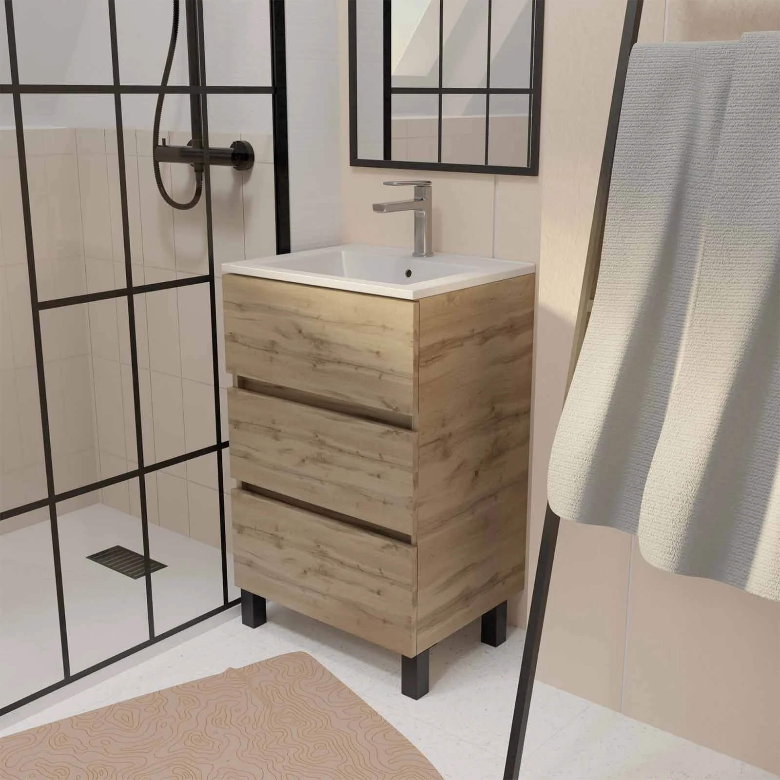 Avec son caisson en mélaminé décor bois et ses 3 tiroirs assorties, ce meuble apporte une touche chaleureuse et naturelle à votre salle de bains. La vasque en céramique blanche à encastrer, aux dimensions de 51x41x17 cm (Bords 2 cm), offre une esthétique moderne et épurée. Ce meuble combine élégance et fonctionnalité pour répondre aux besoins des petits espaces sans sacrifier le style.