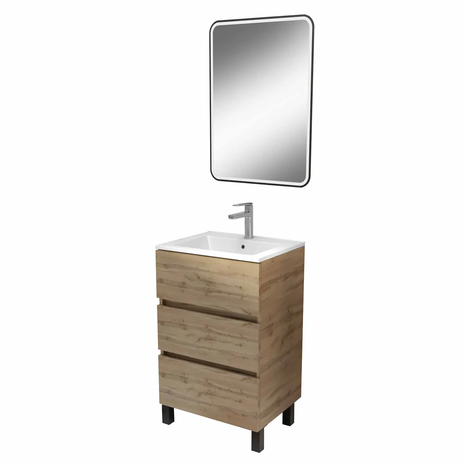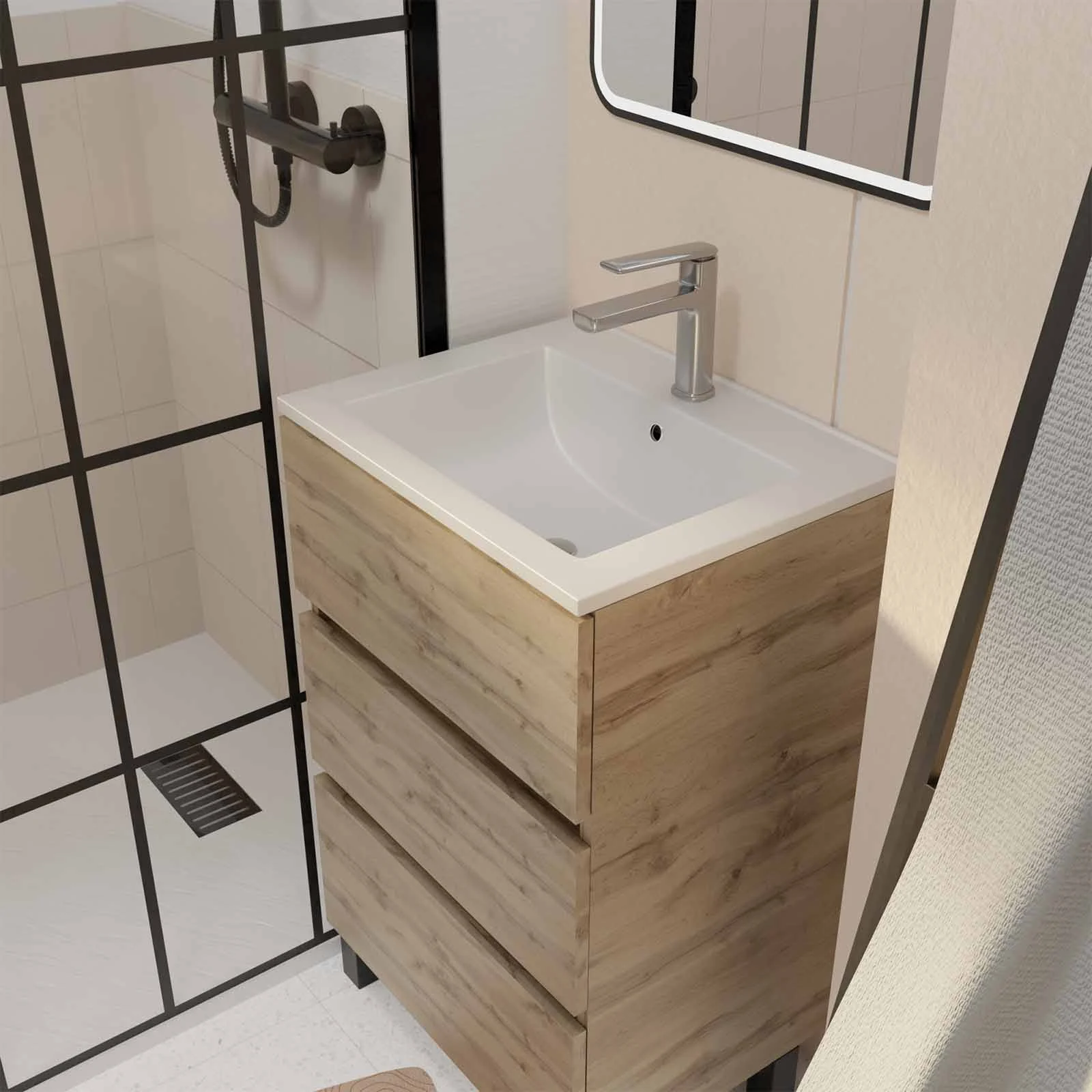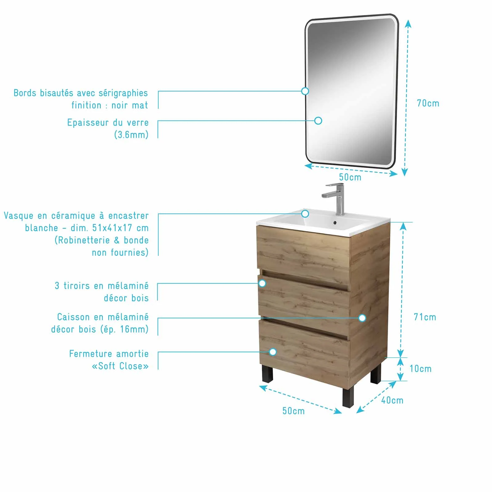 0 avis TIMBER Meuble de Salle de Bains 50cm TIMBER - 3 Tiroirs Décor Chêne, Vasque Blanche et Miroir Led 50x70 cm