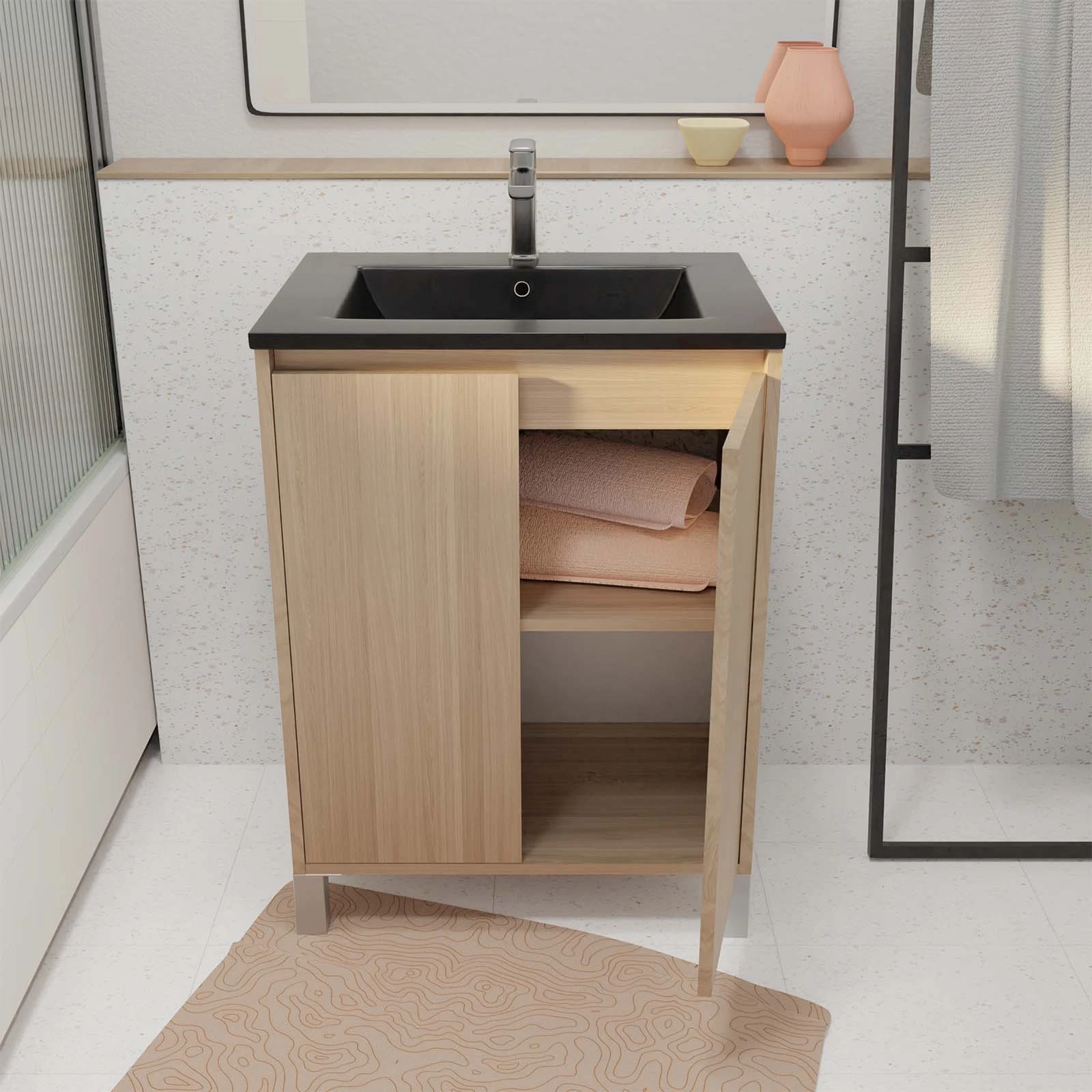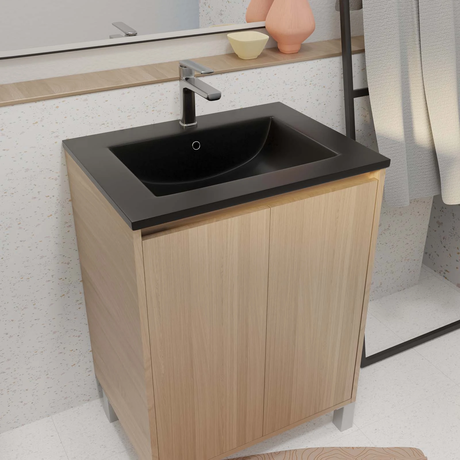 Meuble de salle de bains 60 cm 2 Portes Chêne Clair + Vasque Céramique Noire – XENOS