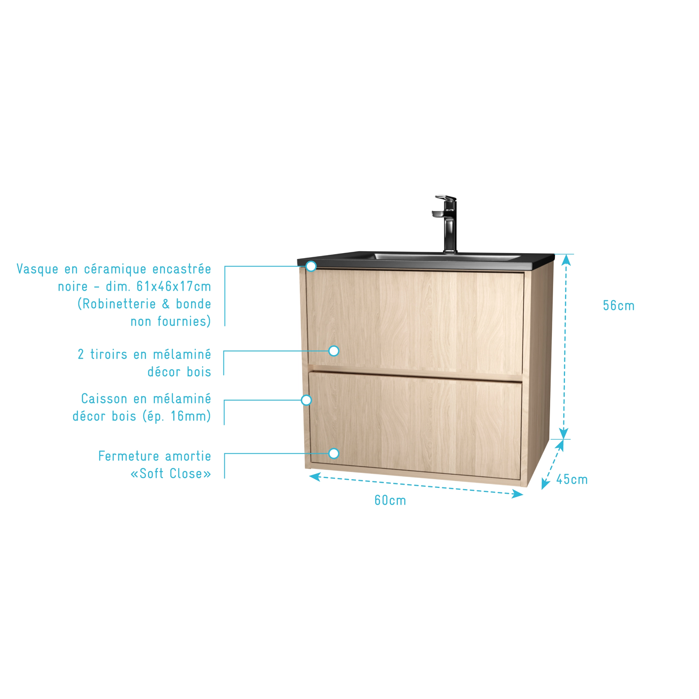 Meuble de salle de bains 60 cm 2 Tiroirs Chêne Clair + Vasque Céramique Noire – XENOS