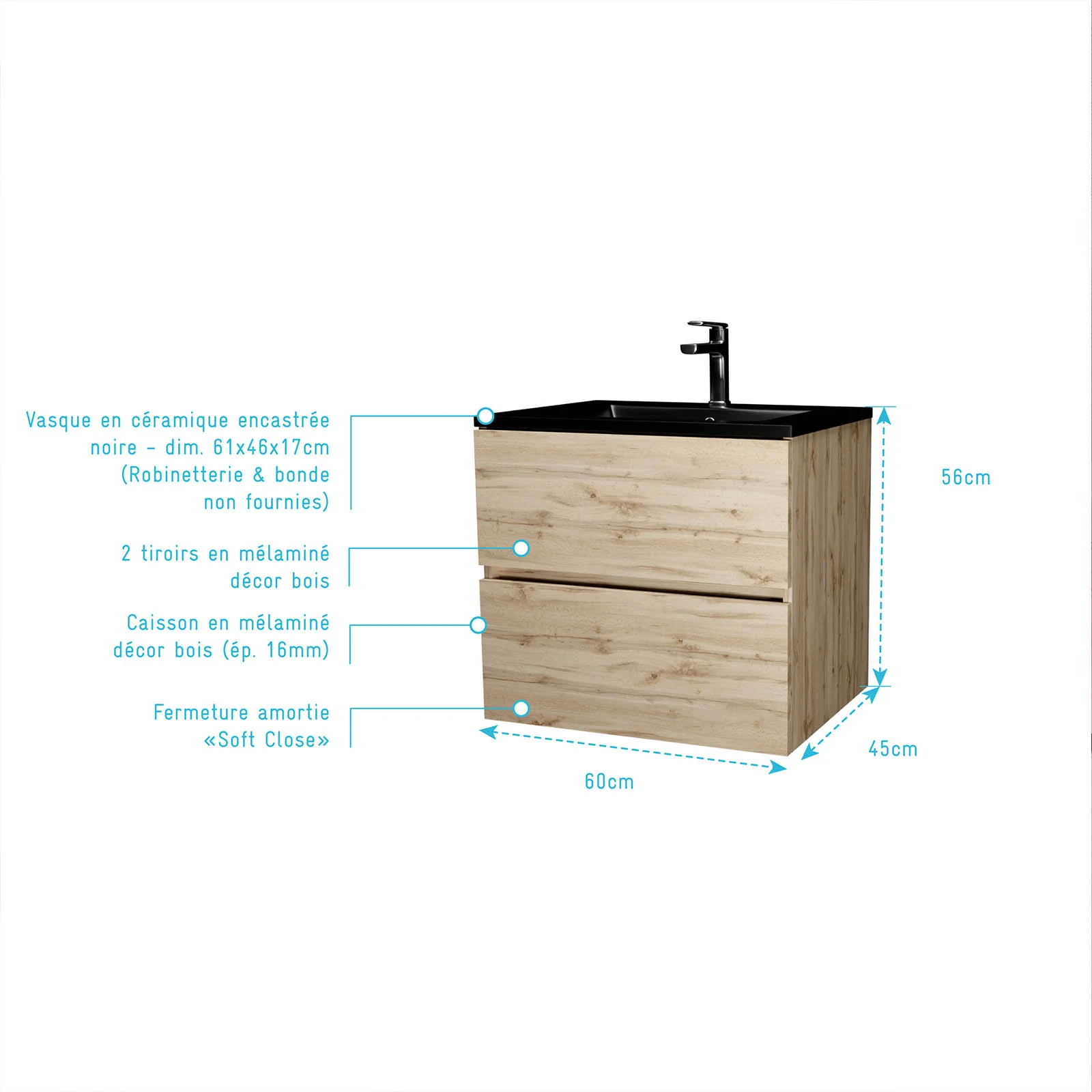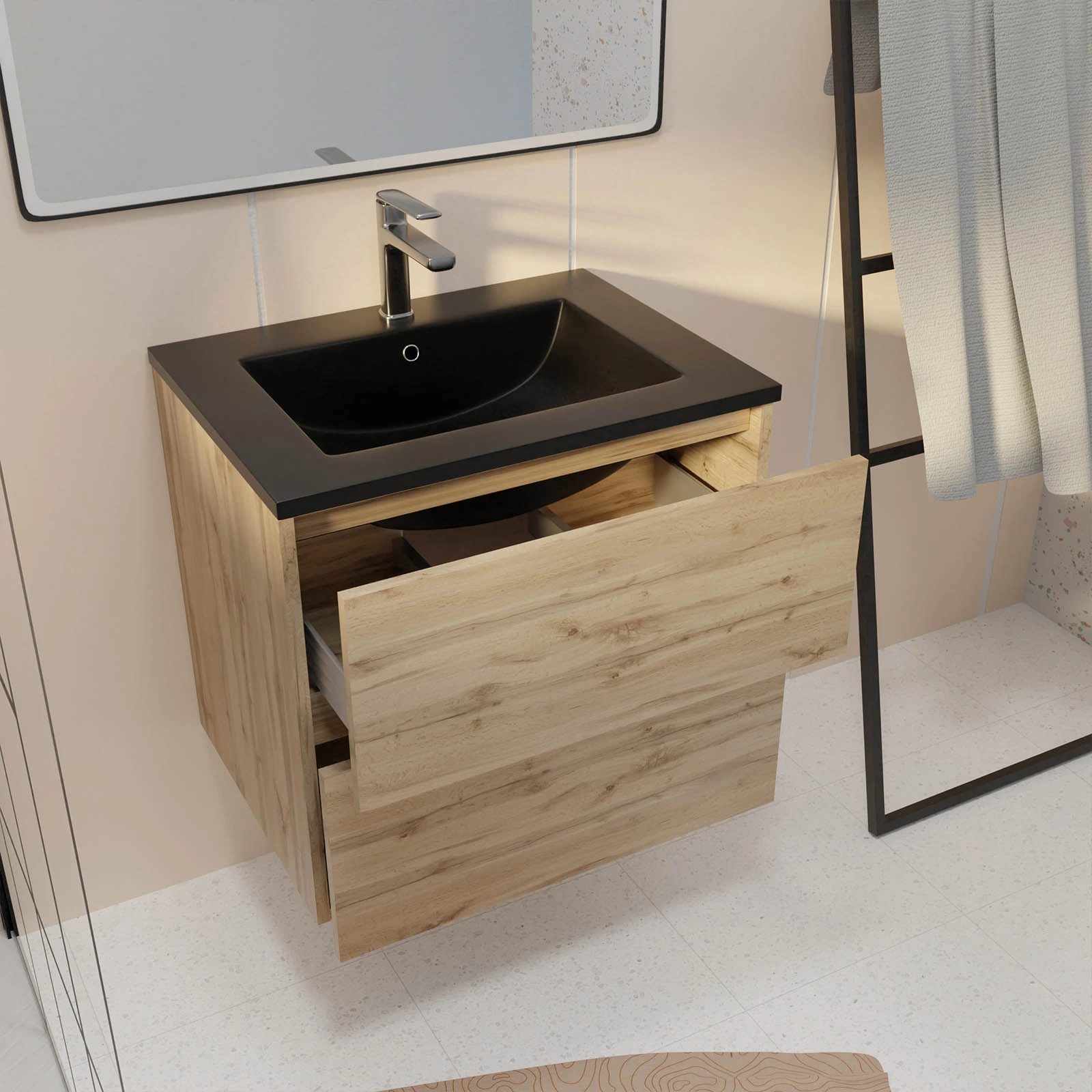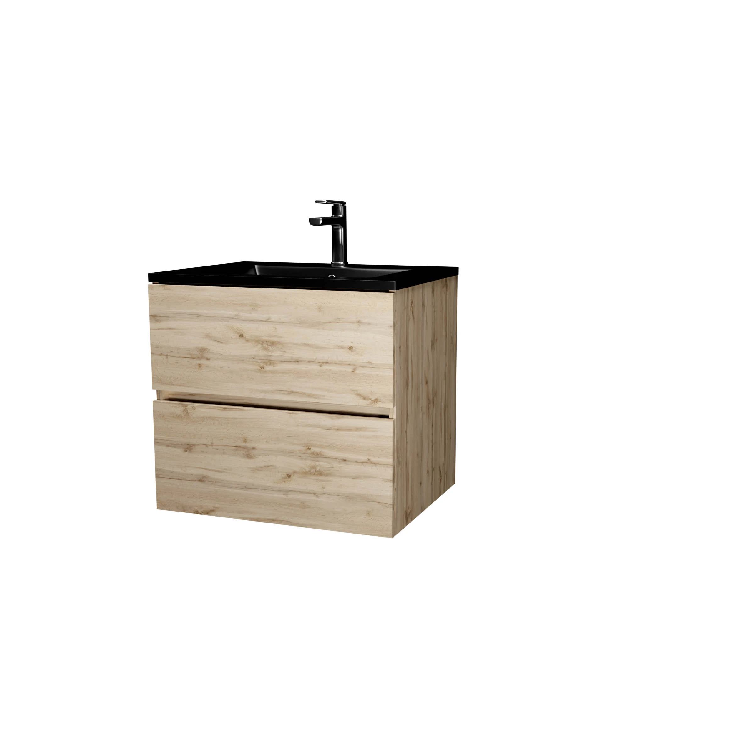 Meuble de salle de bains 60 cm 2 Tiroirs Chêne Naturel + Vasque Céramique Noire – TIMBER