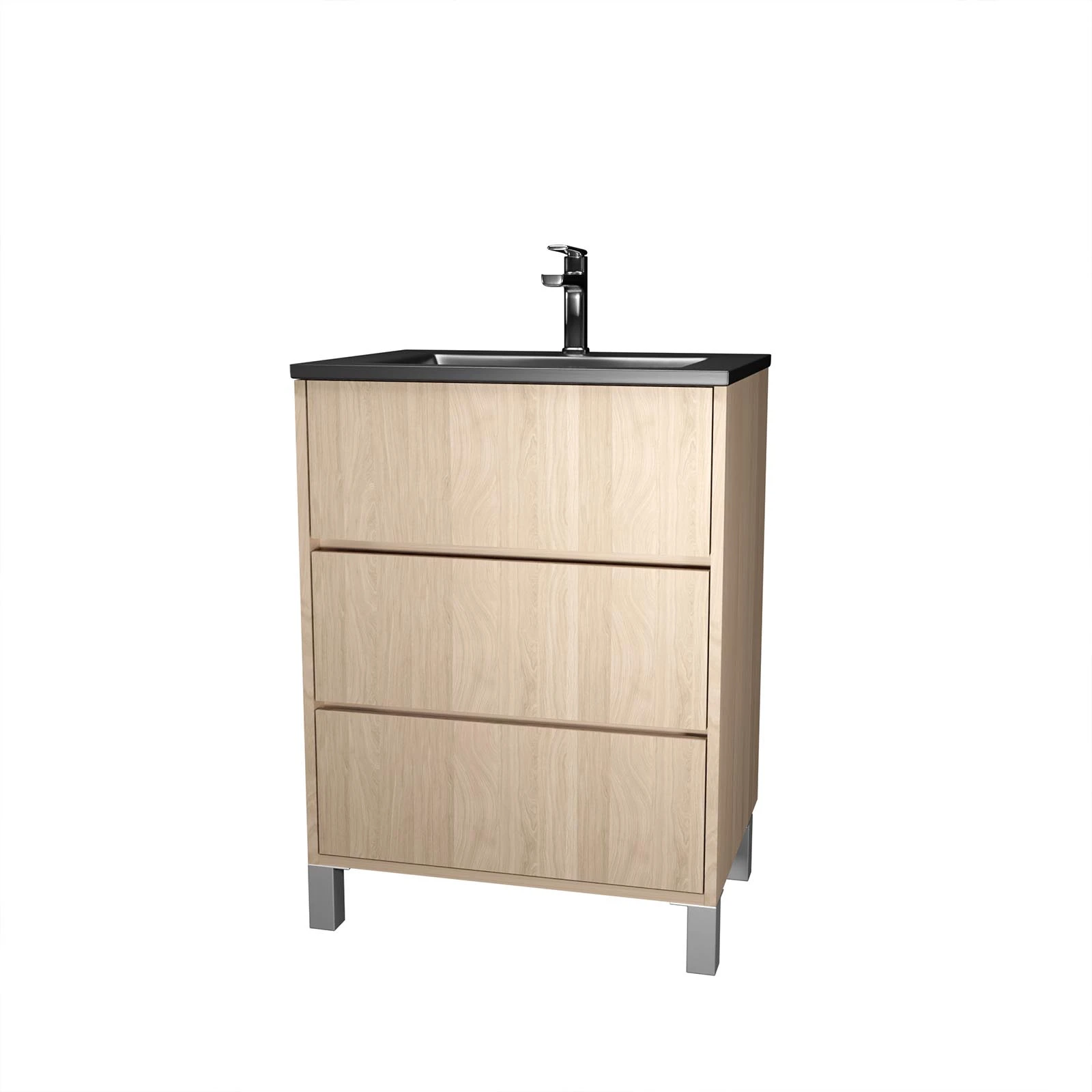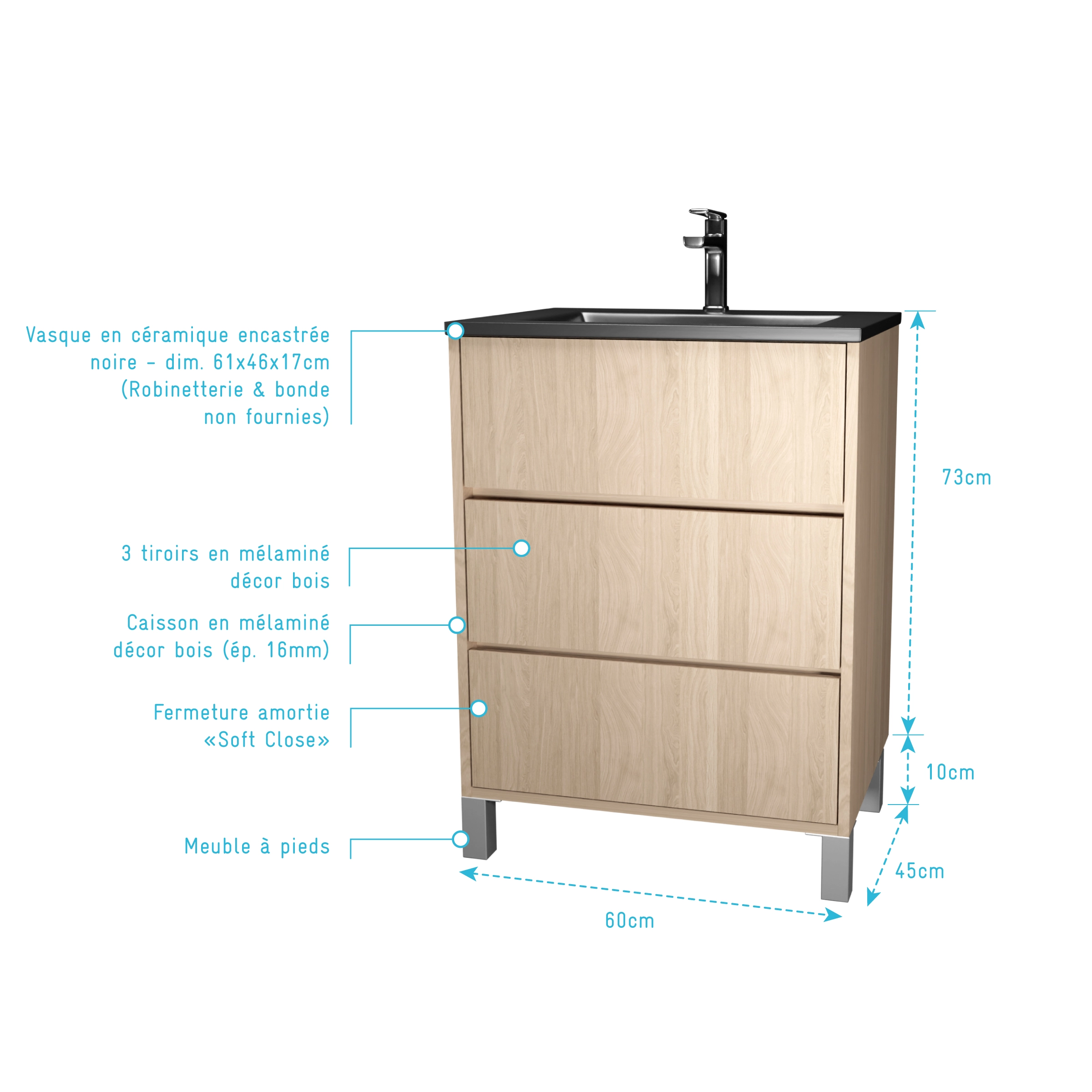 Meuble de salle de bains 60 cm 3 Tiroirs Chêne Clair + Vasque Céramique Noire – XENOS