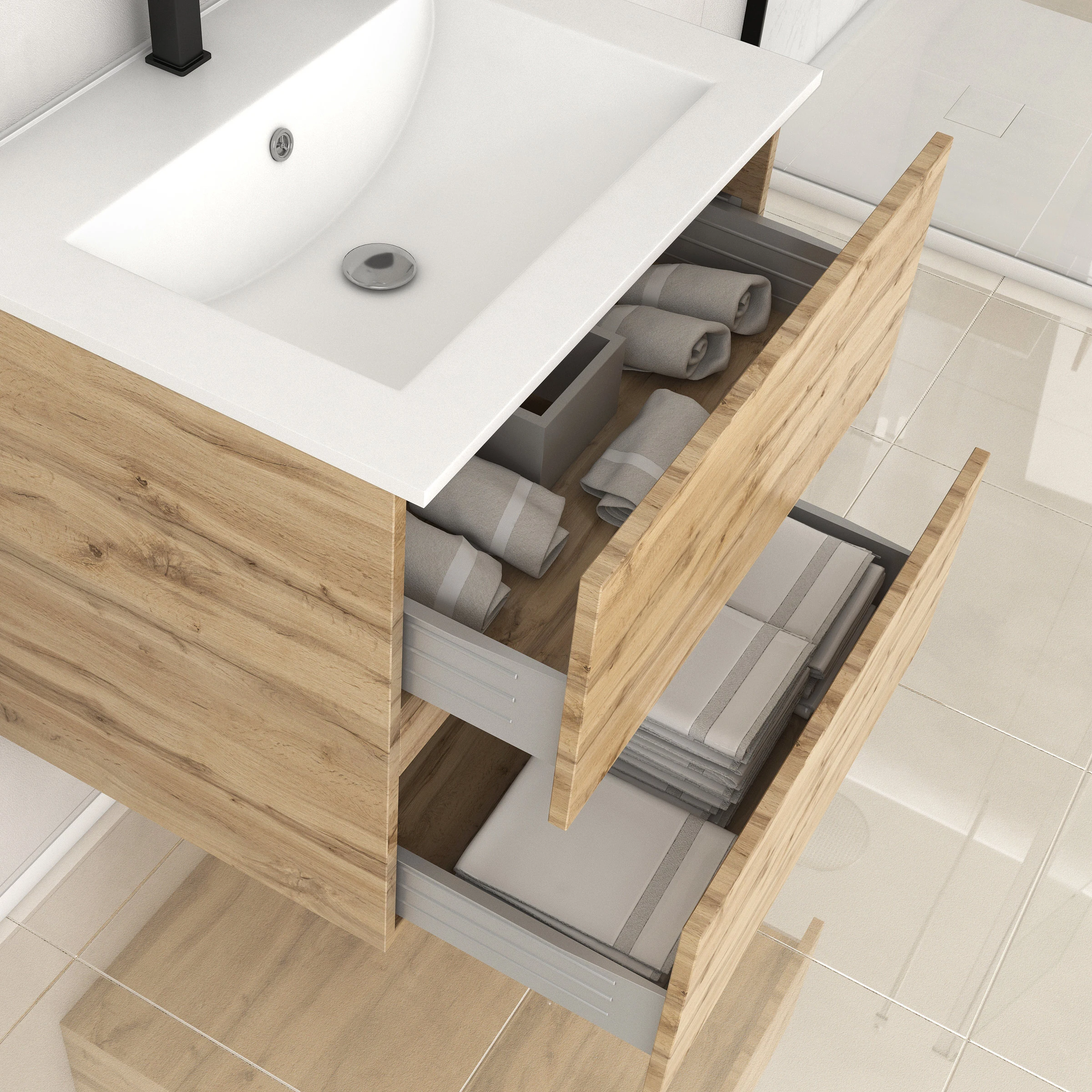 0 avis ELEMENTARY Meuble de Salle de Bains 60cm Suspendu Decor Bois Clair 2 Tiroirs - Vasque Blanche - ELEMENTARY