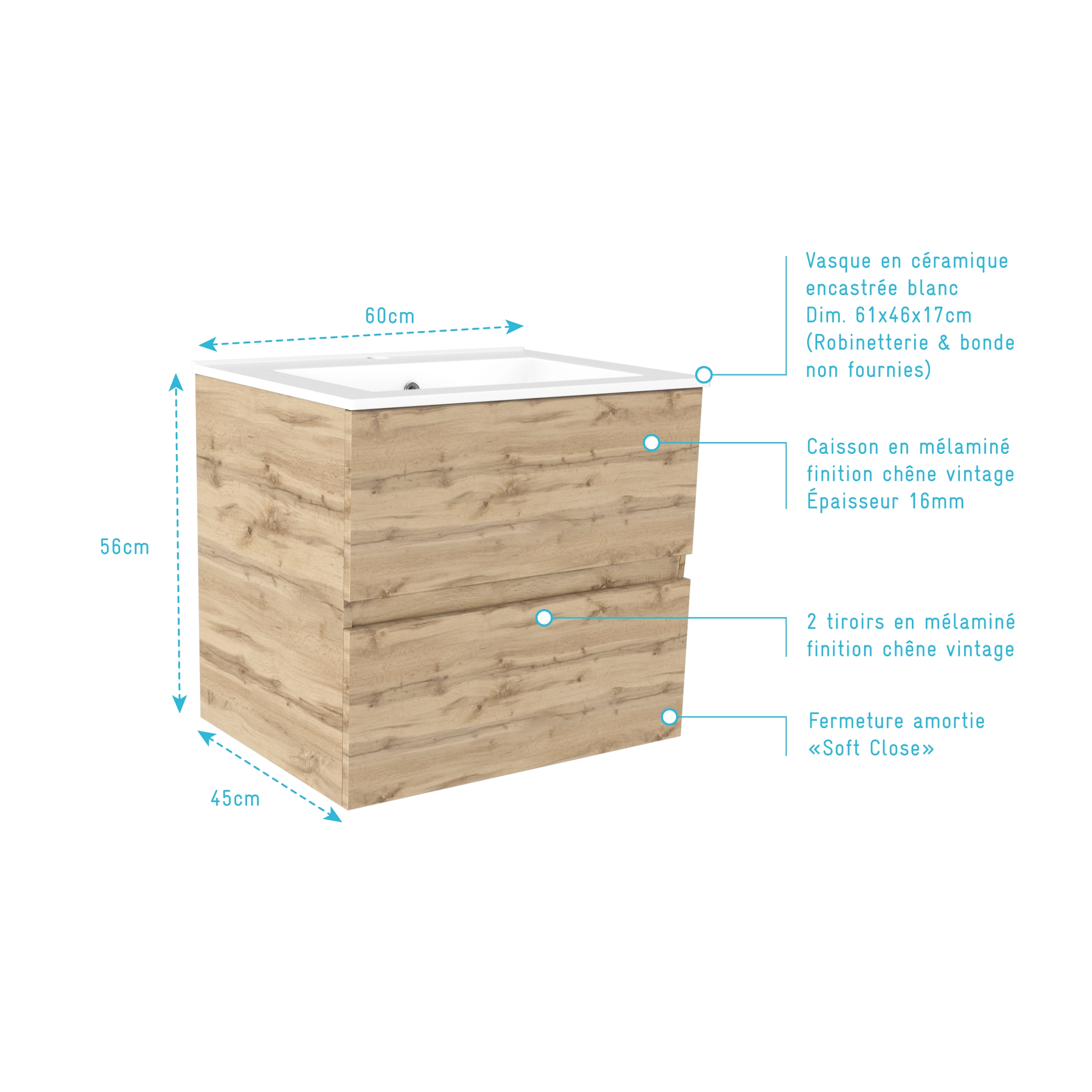 Meuble de salle de bains 60cm 2 Tiroirs_Chêne Naturel + Vasque céramique blanche – TIMBER 60