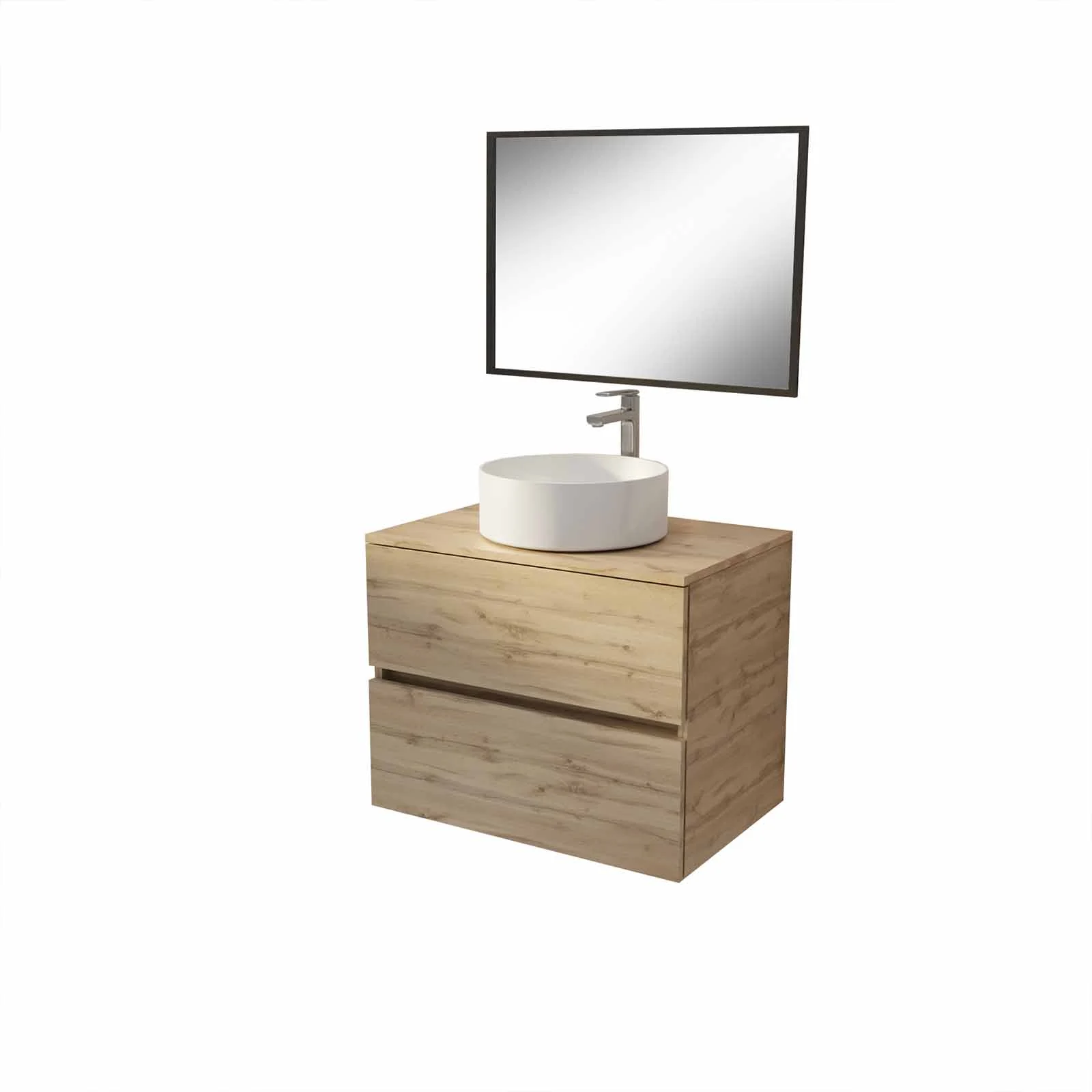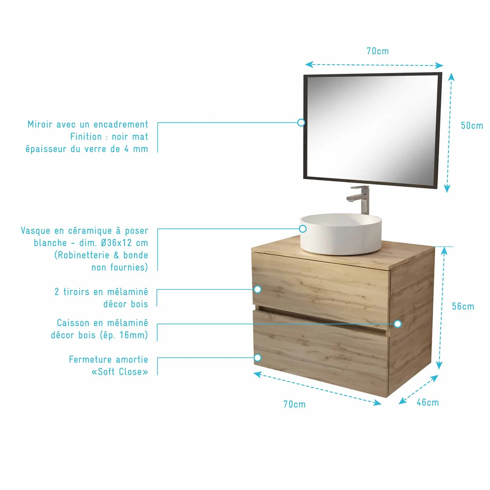 Meuble de salle de bains 70 cm TIMBER Décor Chêne 2 tiroirs Vasque blanche sur plan et Miroir 70×50