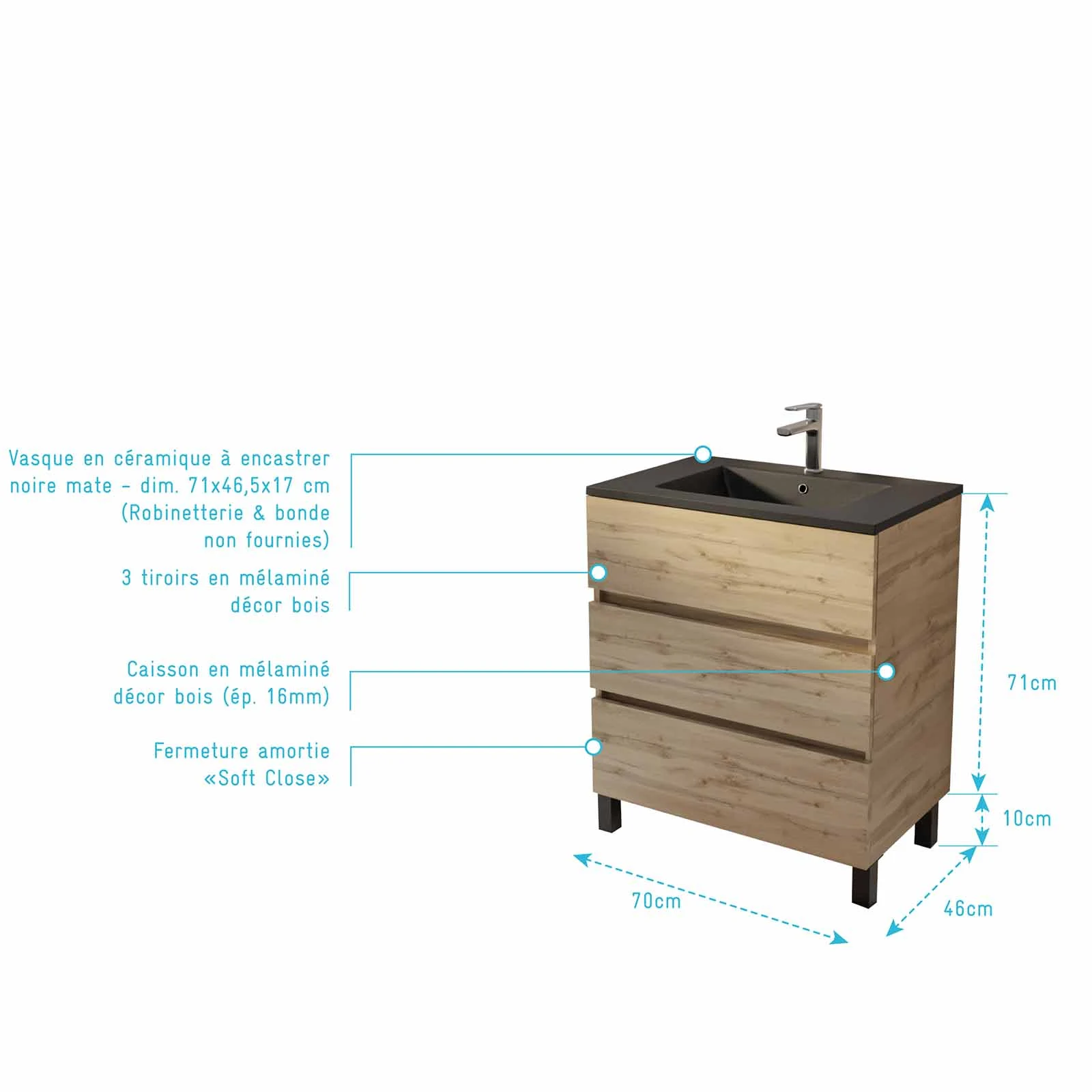 Apportez une touche naturelle et élégante à votre salle de bains avec ce meuble en mélaminé décor bois sur pieds. Ses lignes épurées et sa finition bois chaleureuse créent une ambiance raffinée. Pratique et design, ses 3 tiroirs offrent un bel espace de rangement. Grâce à son système de fermeture douce ‘Soft Close’, profitez d’un confort optimal au quotidien. Un meuble aussi esthétique que fonctionnel ! Son design épuré est réhaussé par une vasque en céramique noire.