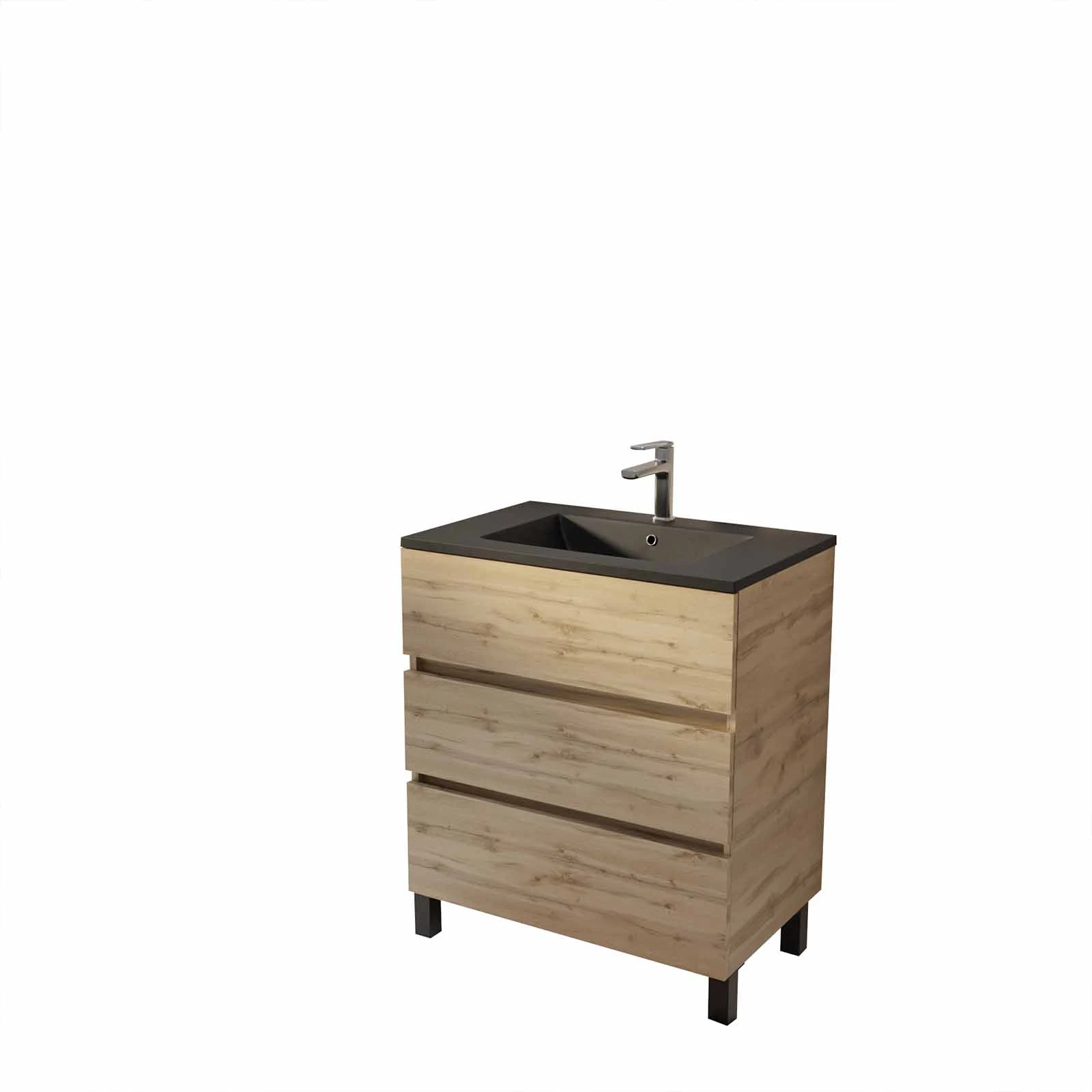Meuble de salle de bains 70 cm TIMBER – Décor Chêne Naturel 3 tiroirs avec Vasque noire