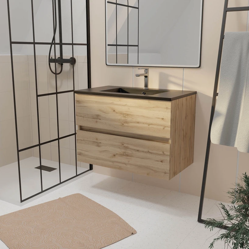 Meuble de salle de bains 80 cm 2 Tiroirs Chêne Naturel + Vasque Céramique Noire – TIMBER