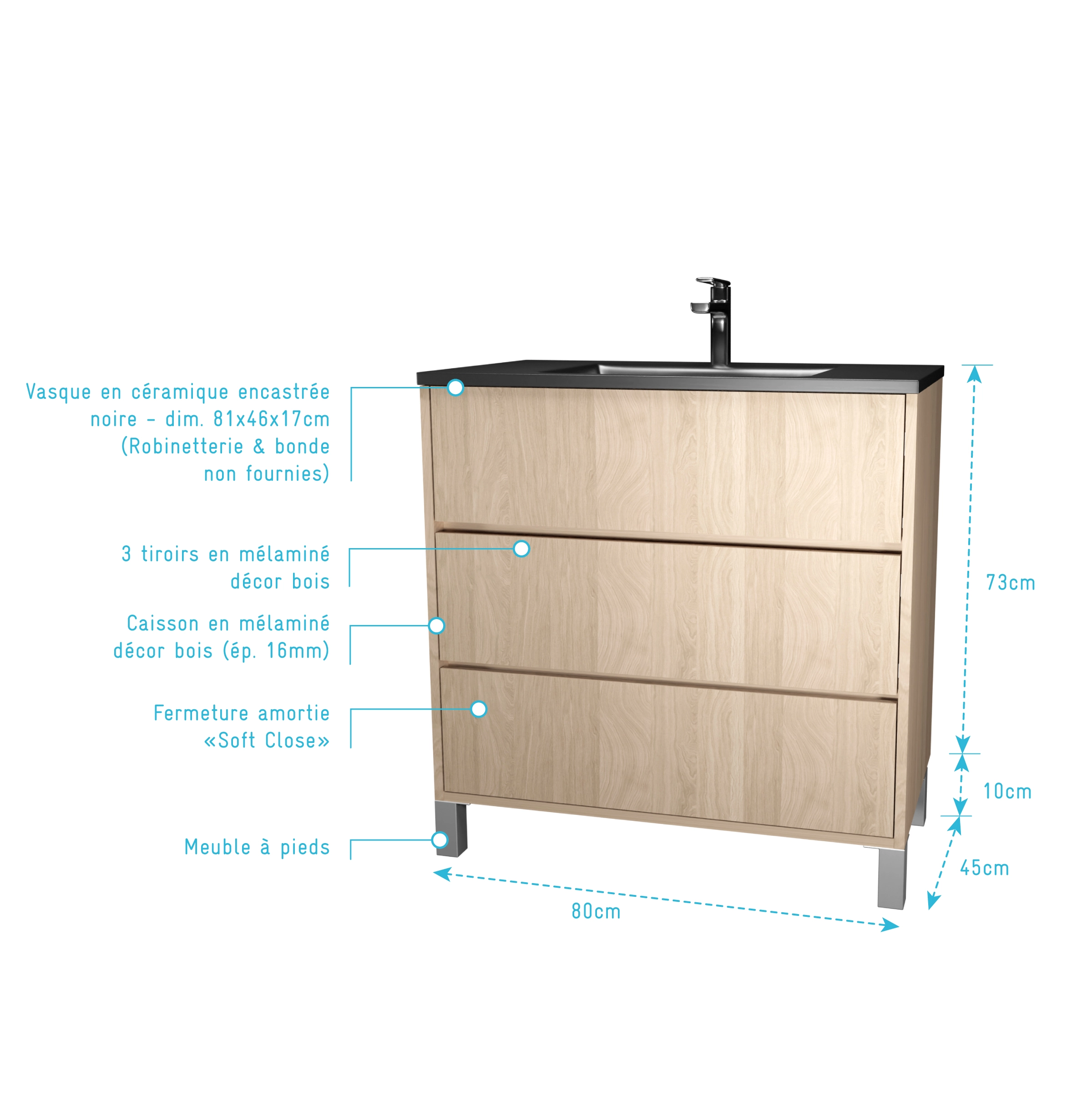1 avis pour Meuble de salle de bains 80 cm 3 Tiroirs Chêne Clair + Vasque Céramique Noire – XENOS