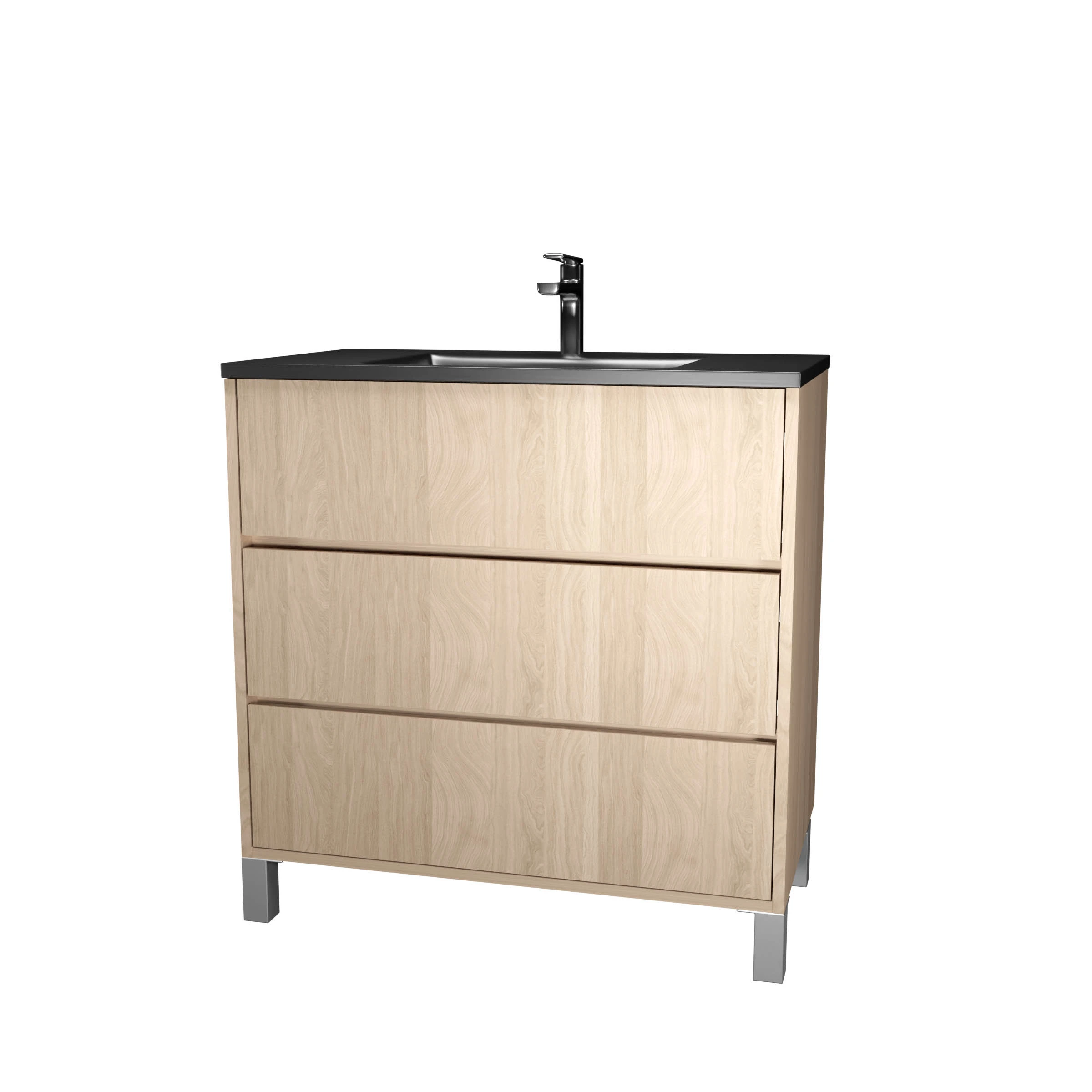 Meuble de salle de bains 80 cm 3 Tiroirs Chêne Clair + Vasque Céramique Noire – XENOS