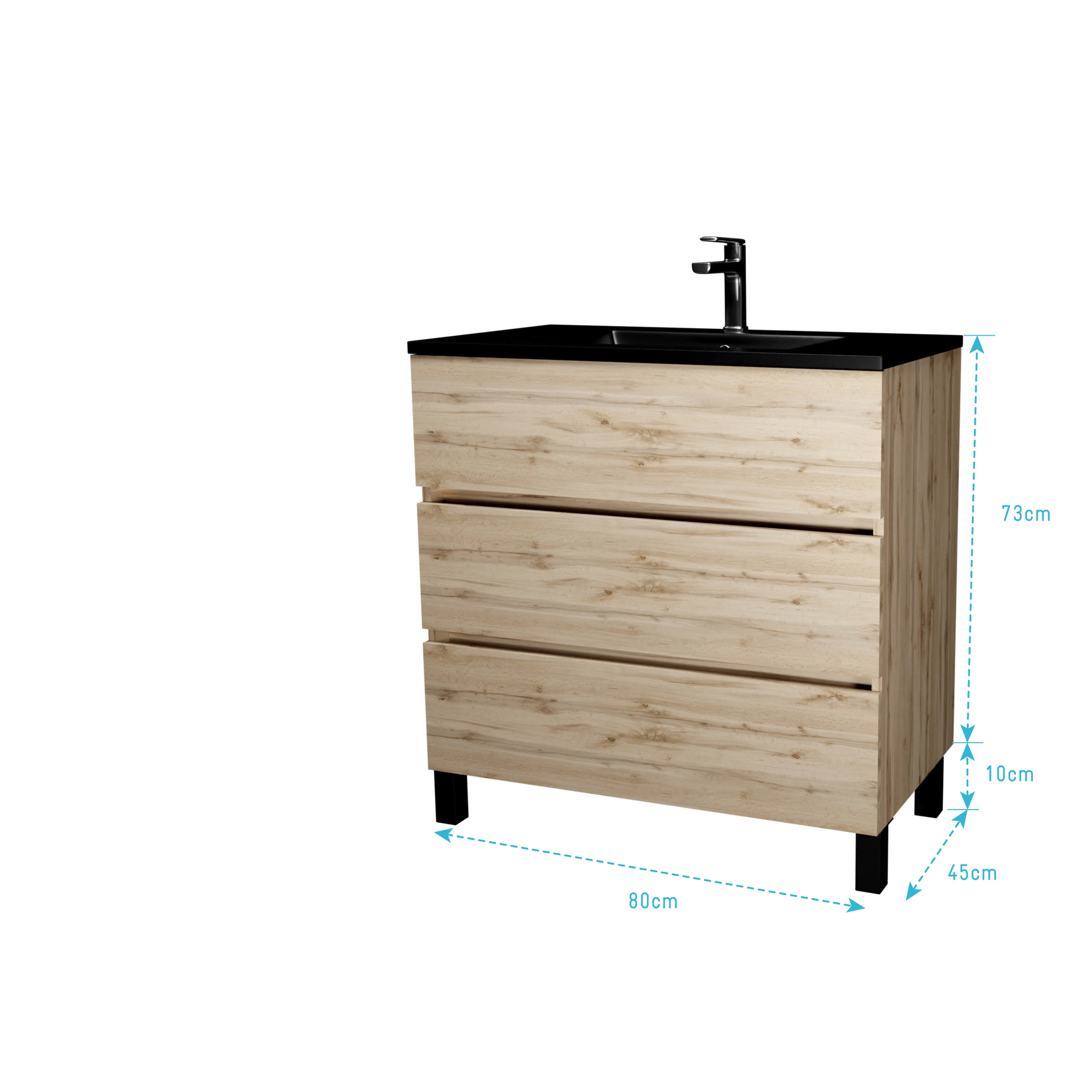 13 avis pour Meuble de salle de bains 80 cm 3 Tiroirs Chêne Naturel + Vasque Céramique Noire – TIMBER