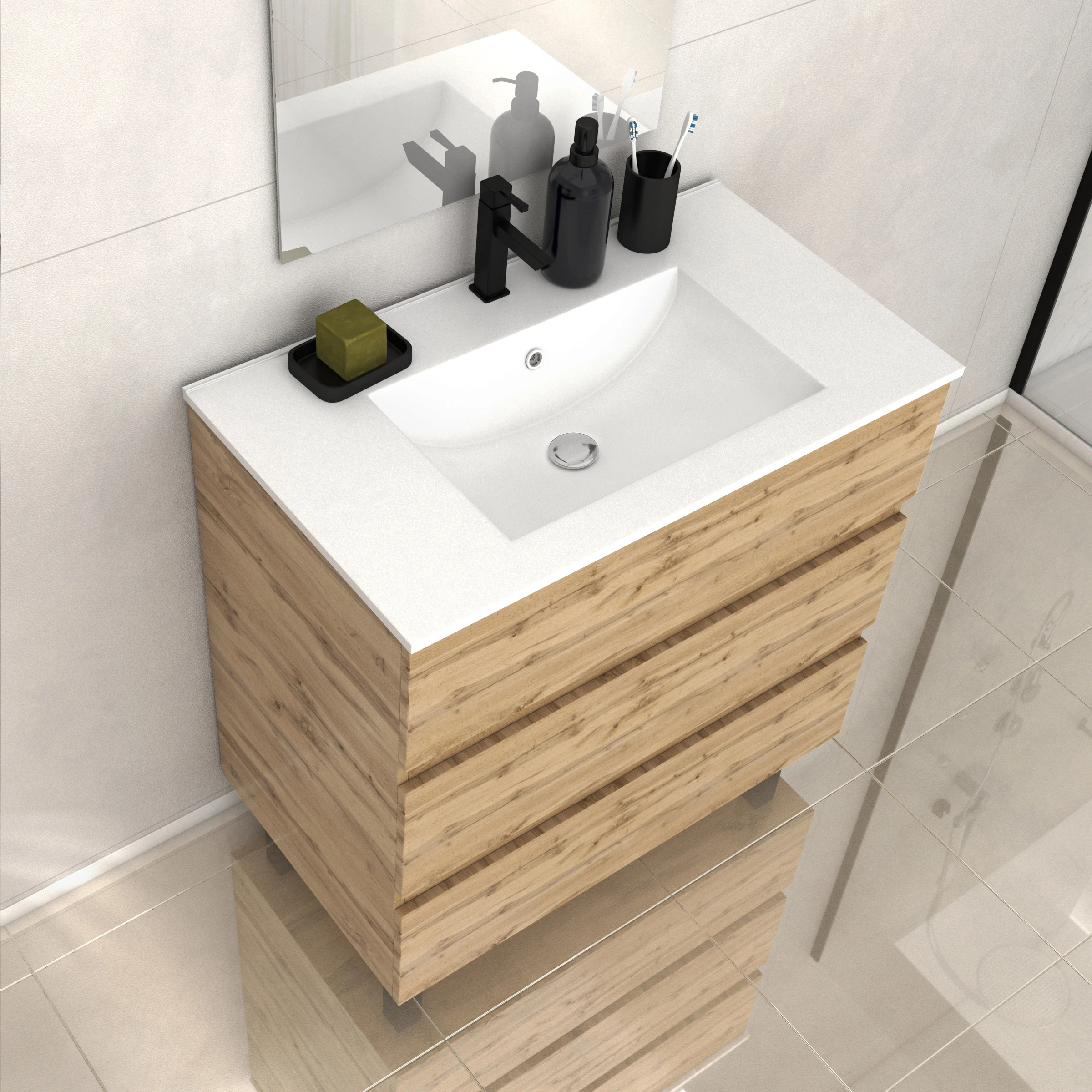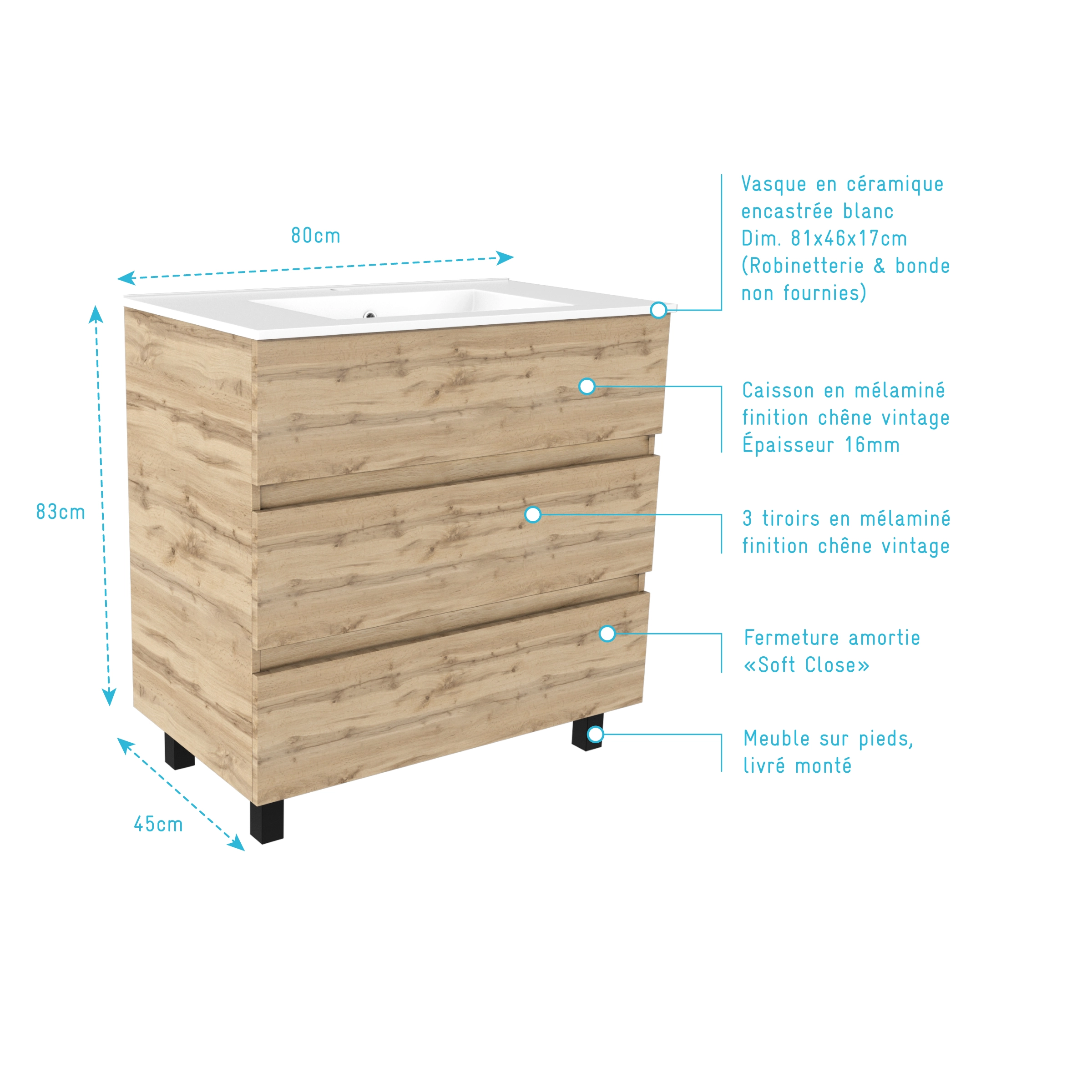 2 avis pour Meuble de salle de bains 80cm 3 Tiroirs_Chêne Naturel + Vasque céramique blanche – TIMBER 80