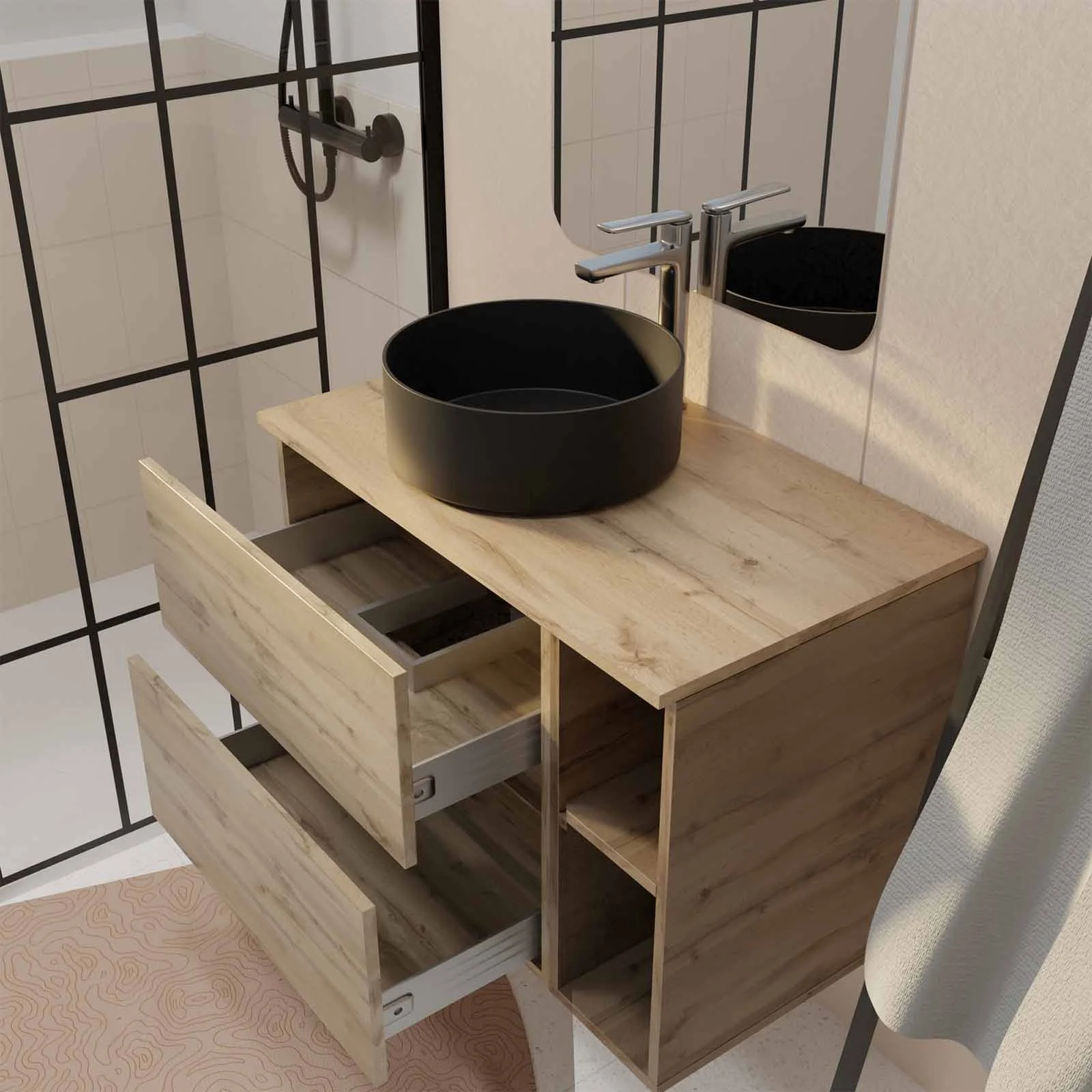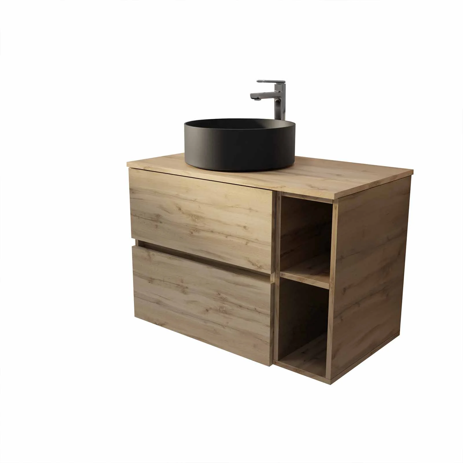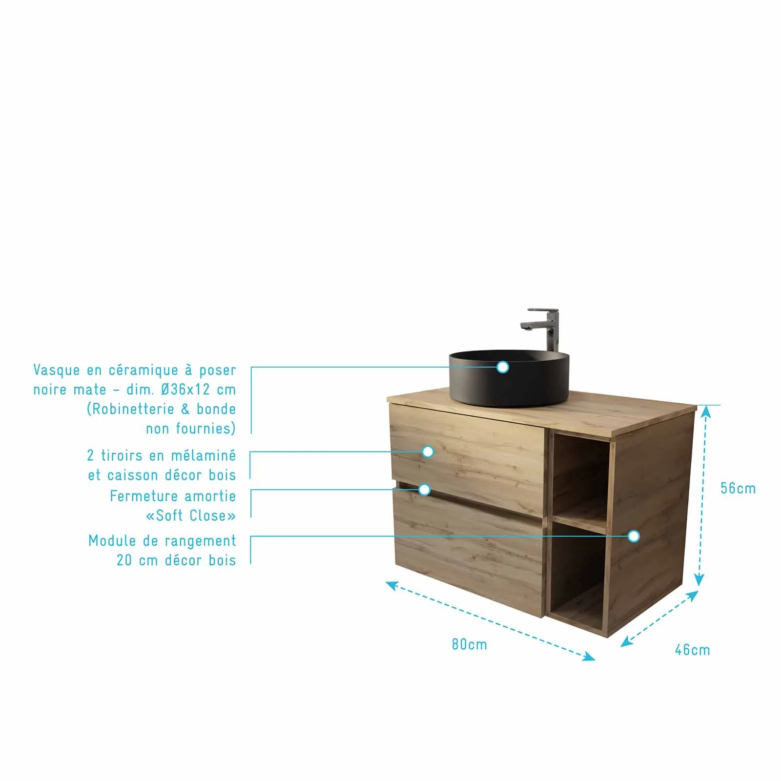 Meuble de salle de bains 80cm TIMBER Décor Chêne 2 Tiroirs et Module – Plan et Vasque Noire