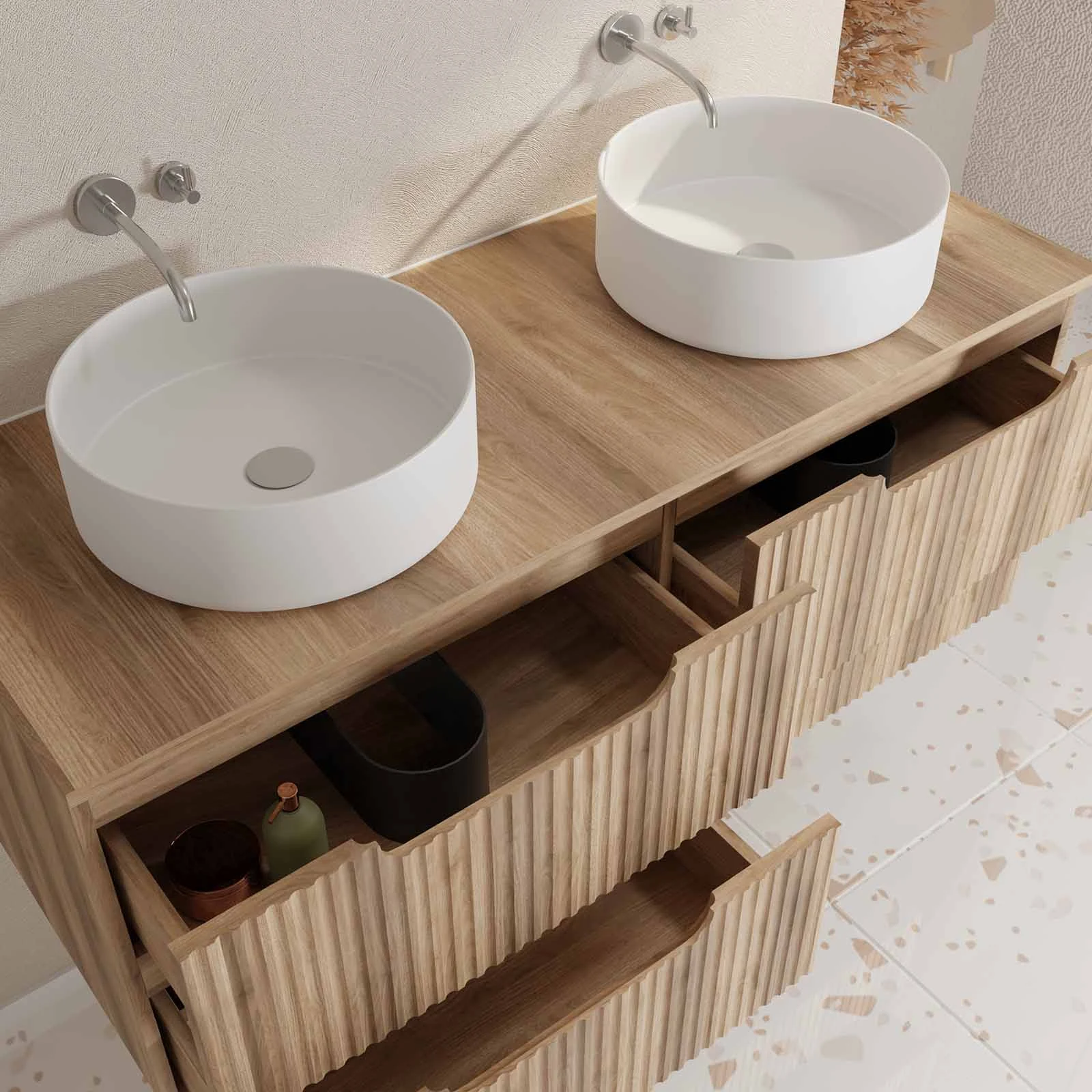 Meuble de Salle de Bains LEON 120cm Décor Bois – 4 Tiroirs en MDF Ondules – Vasques Rondes 36cm
